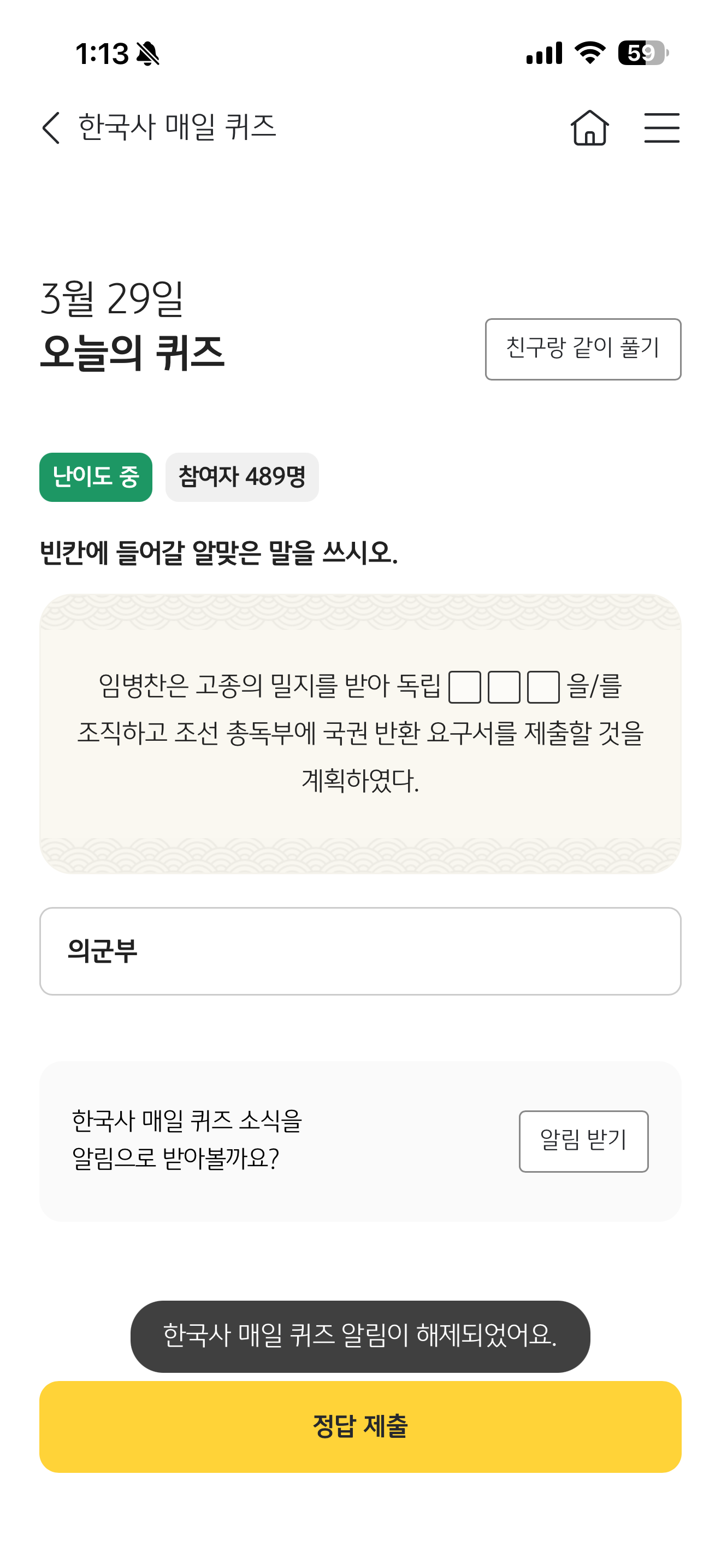 KB스타뱅킹 한국사 매일 퀴즈 정답은 의군부 입니다