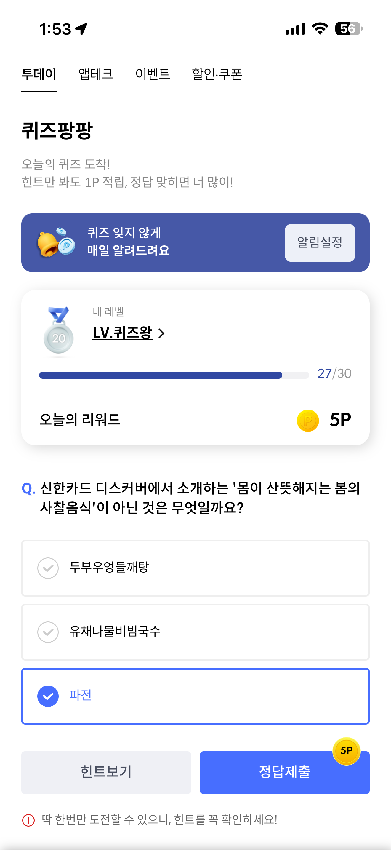 신한카드 퀴즈팡팡 정답은 파전 입니다