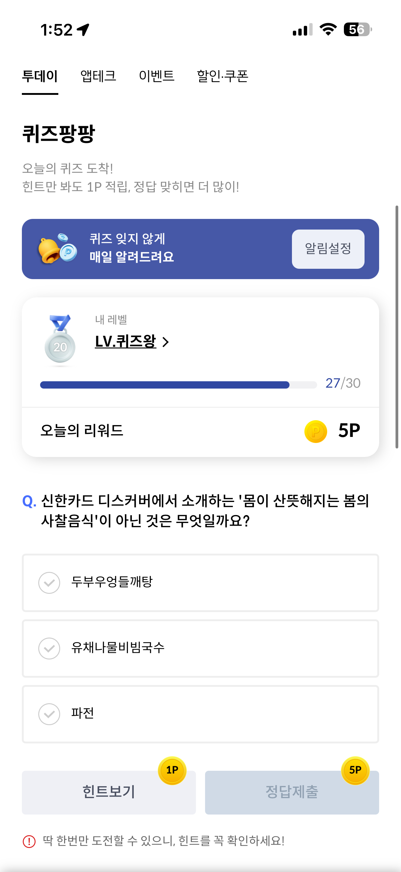 신한카드 퀴즈팡팡 3월 29일 정답(신한카드 디스커버에서 소개하는 '몸이 산뜻해지는 봄의 사찰음식'이 아닌 것은 무엇일까요?)
