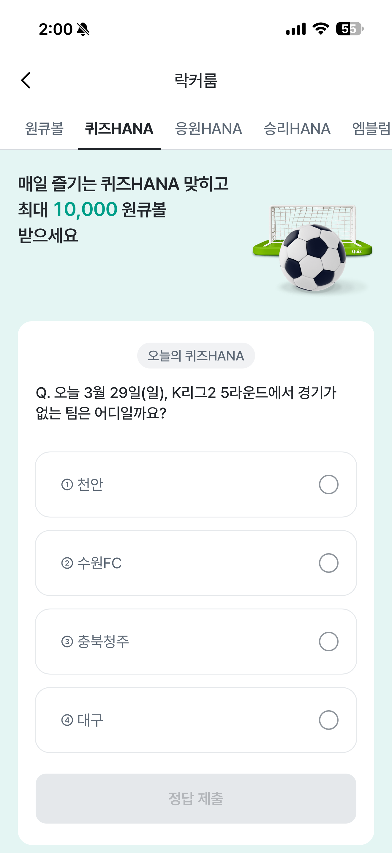 하나원큐 축구 play 퀴즈 HANA 정답은 천안 입니다