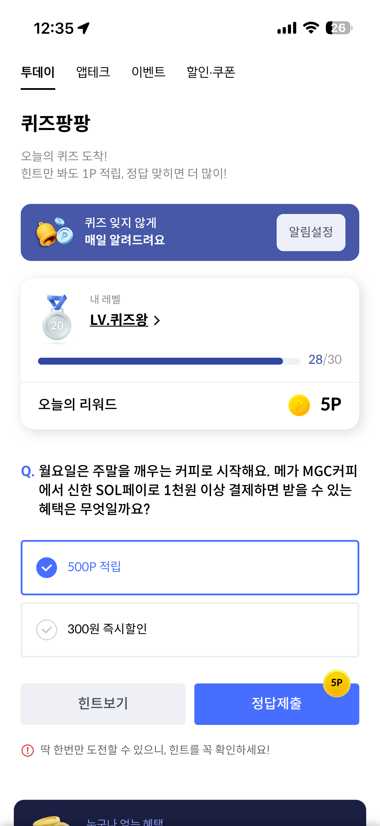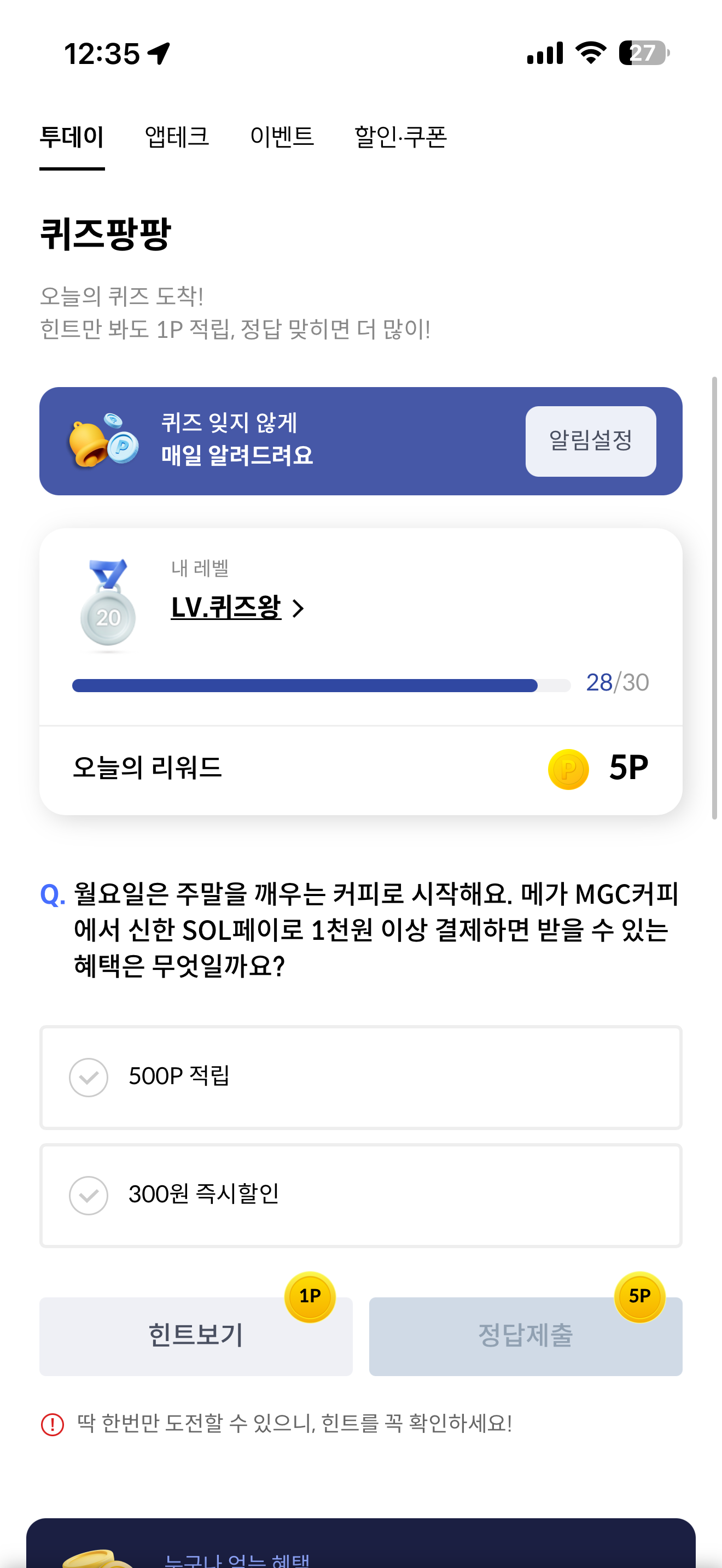월요일은 주말을 깨우는 커피로 시작해요. 메가 MGC커피에서 신한 SOL페이로 1천원 이상 결제하면 받을 수 있는 혜택은 무엇일까요? 보기는 1. 500P 적립 2. 300원 즉시할인 입니다