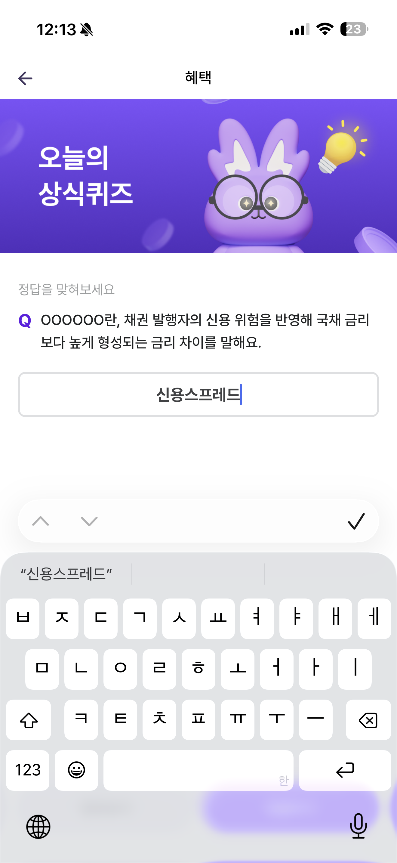 OOOOOO란, 채권 발행자의 신용 위험을 반영해 국채 금리 보다 높게 형성되는 금리 차이를 말해요. 주관식 퀴즈인데요.