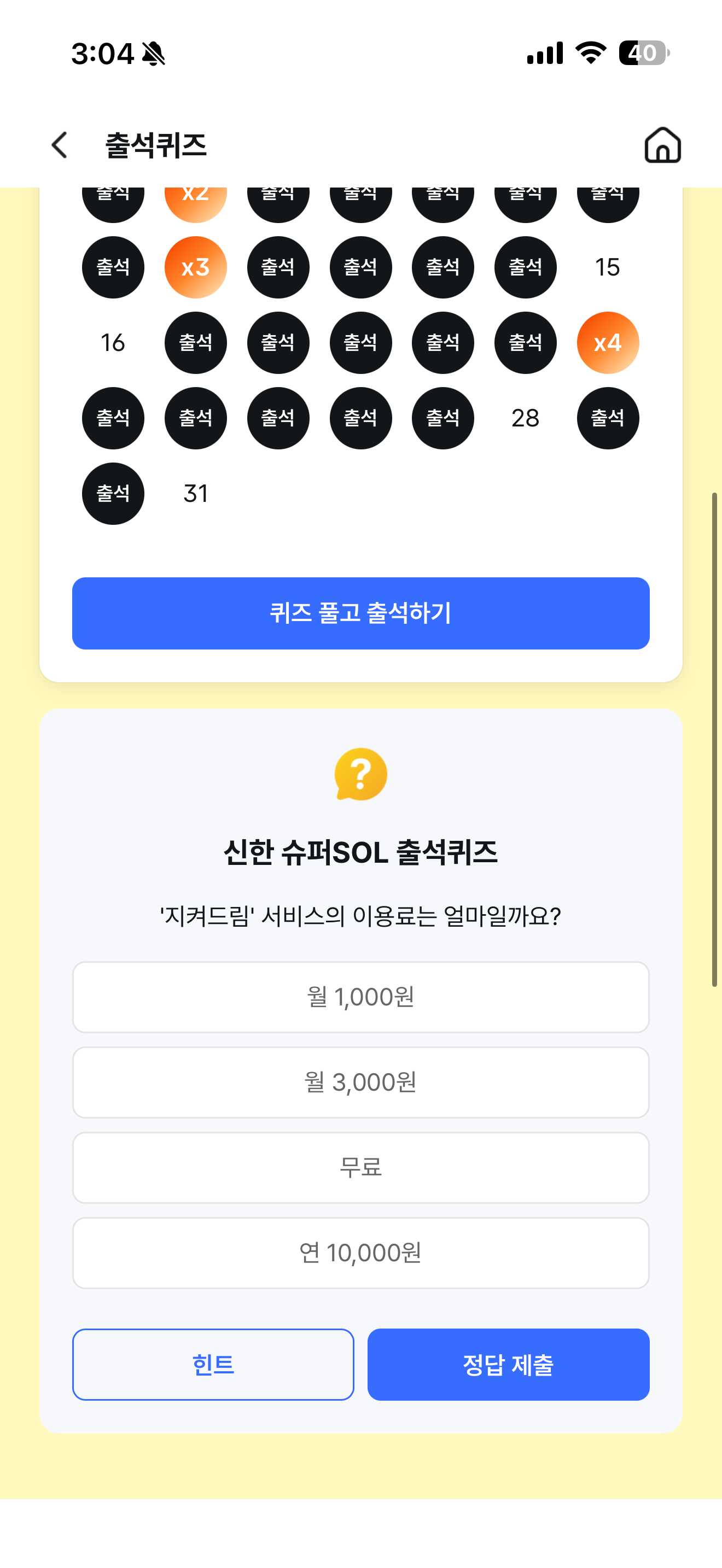 신한 슈퍼SOL 출석퀴즈 정답은 무료 입니다