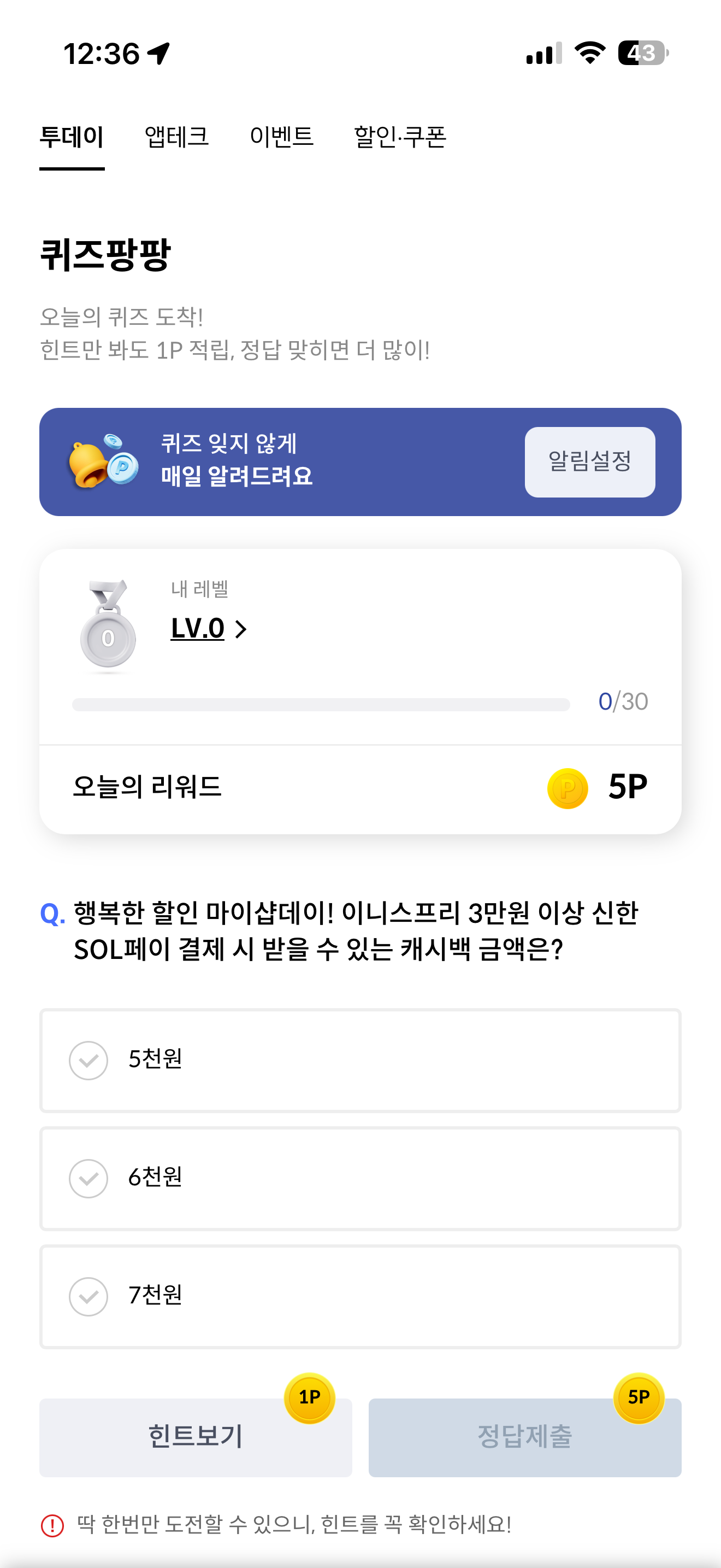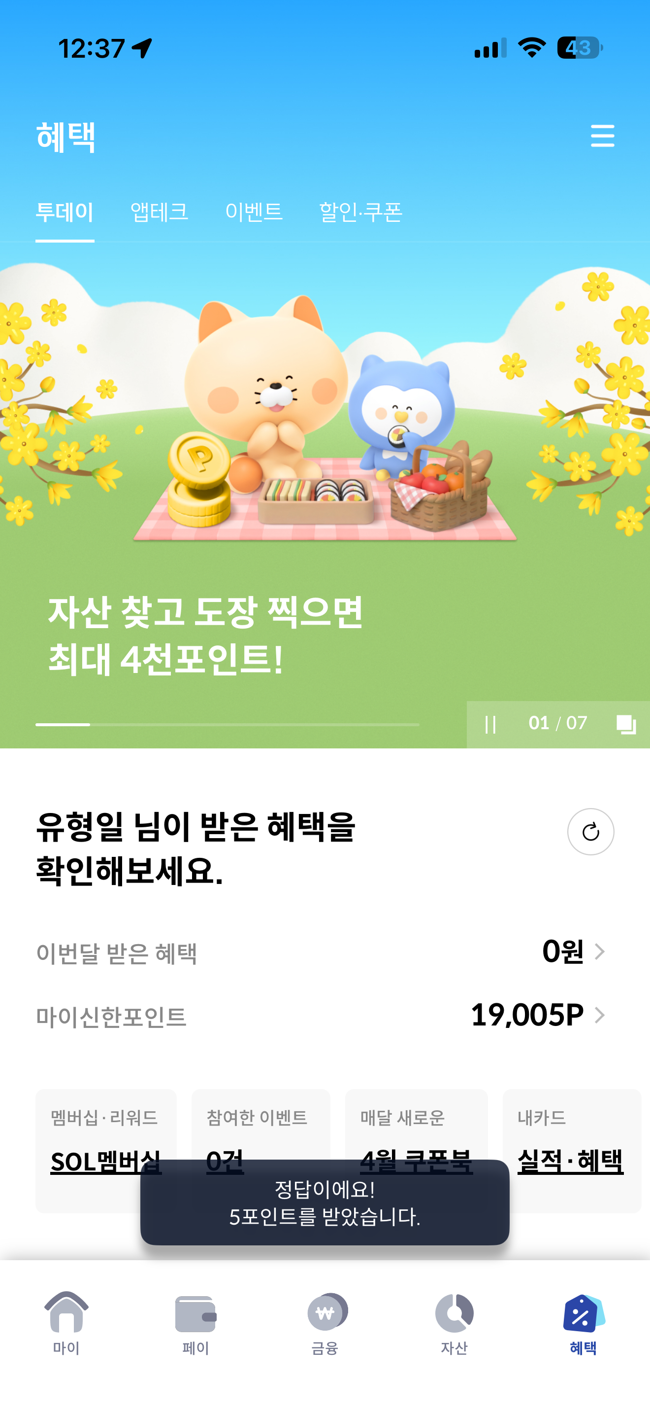 신한카드 퀴즈팡팡 정답은 7천원 입니다