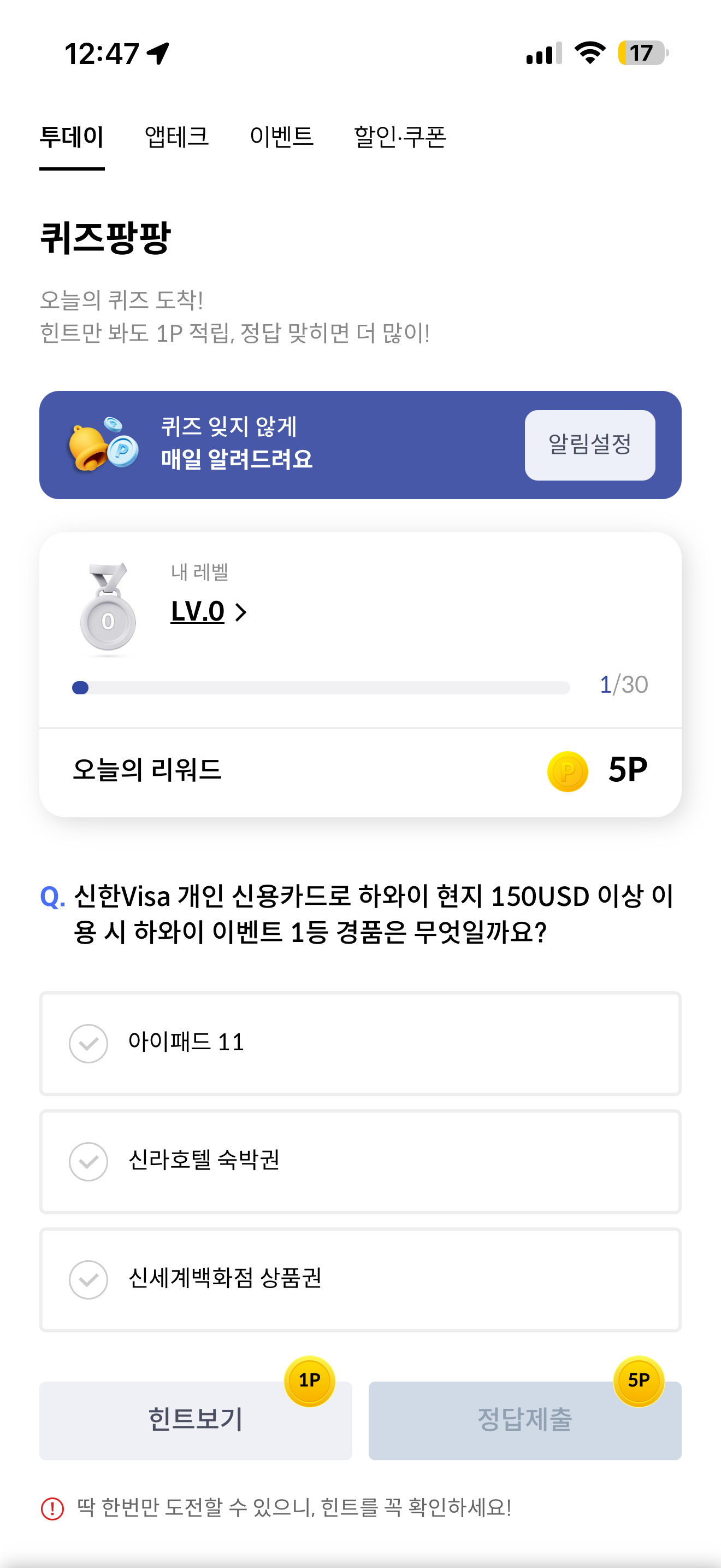 신한Visa 개인 신용카드로 하와이 현지 150USD 이상 이용 시 하와이 이벤트 1등 경품은 무엇일까요? 보기는 1. 아이패드 11 2. 신라호텔 숙박권 3. 신세계백화점 상품권 입니다