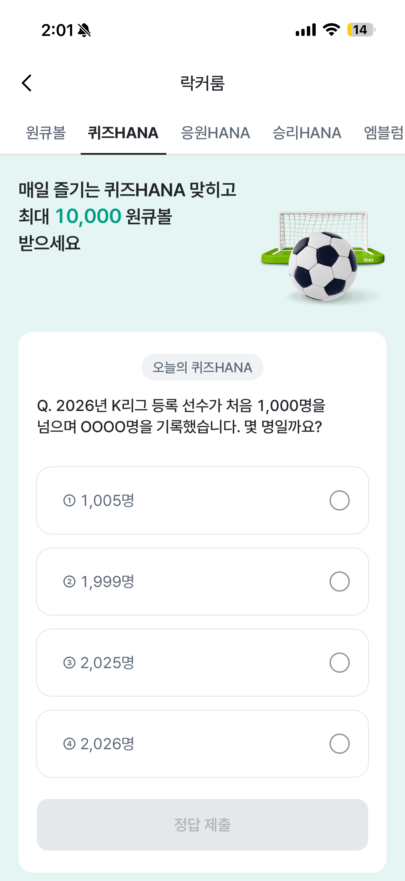 하나원큐 축구 play 퀴즈 HANA 정답은 1,005명 입니다