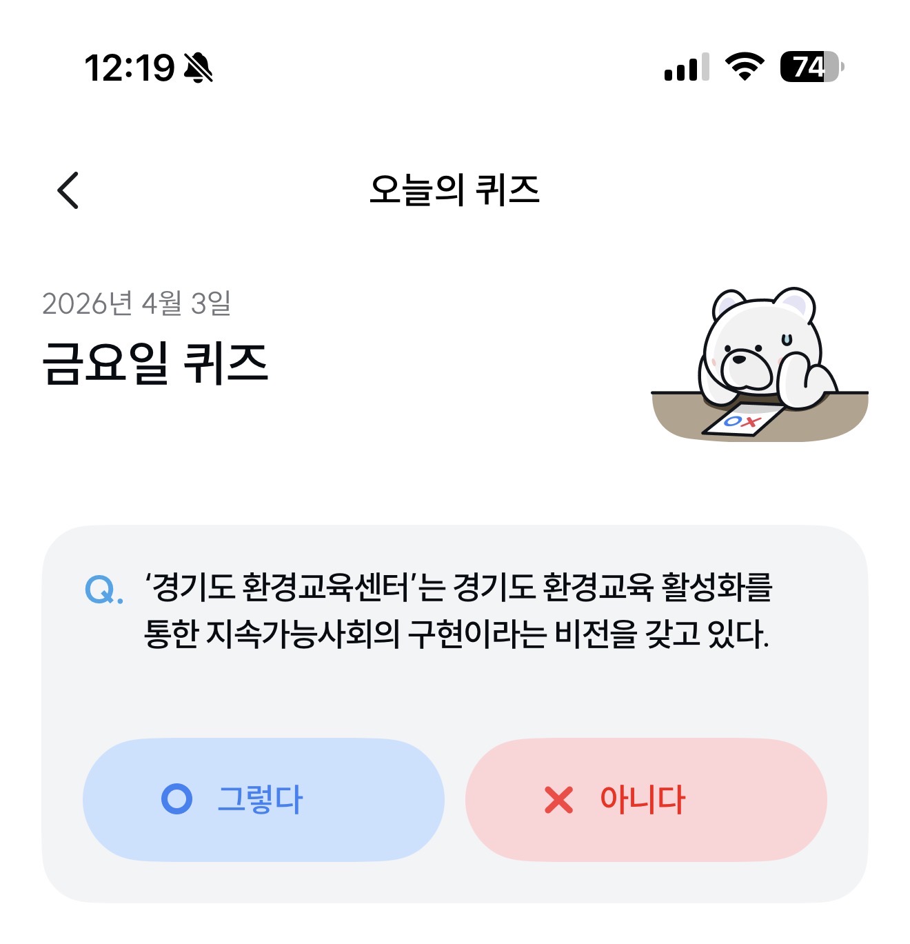 '경기도 환경교육센터'는 경기도 환경교육 활성화를 통한 지속가능사회의 구현이라는 비전을 갖고 있다. 그렇다 아니다 선택하면 되는데요. 경기도 환경교육센터는 뭐하는 곳일까요? 잘 참고해 보세요