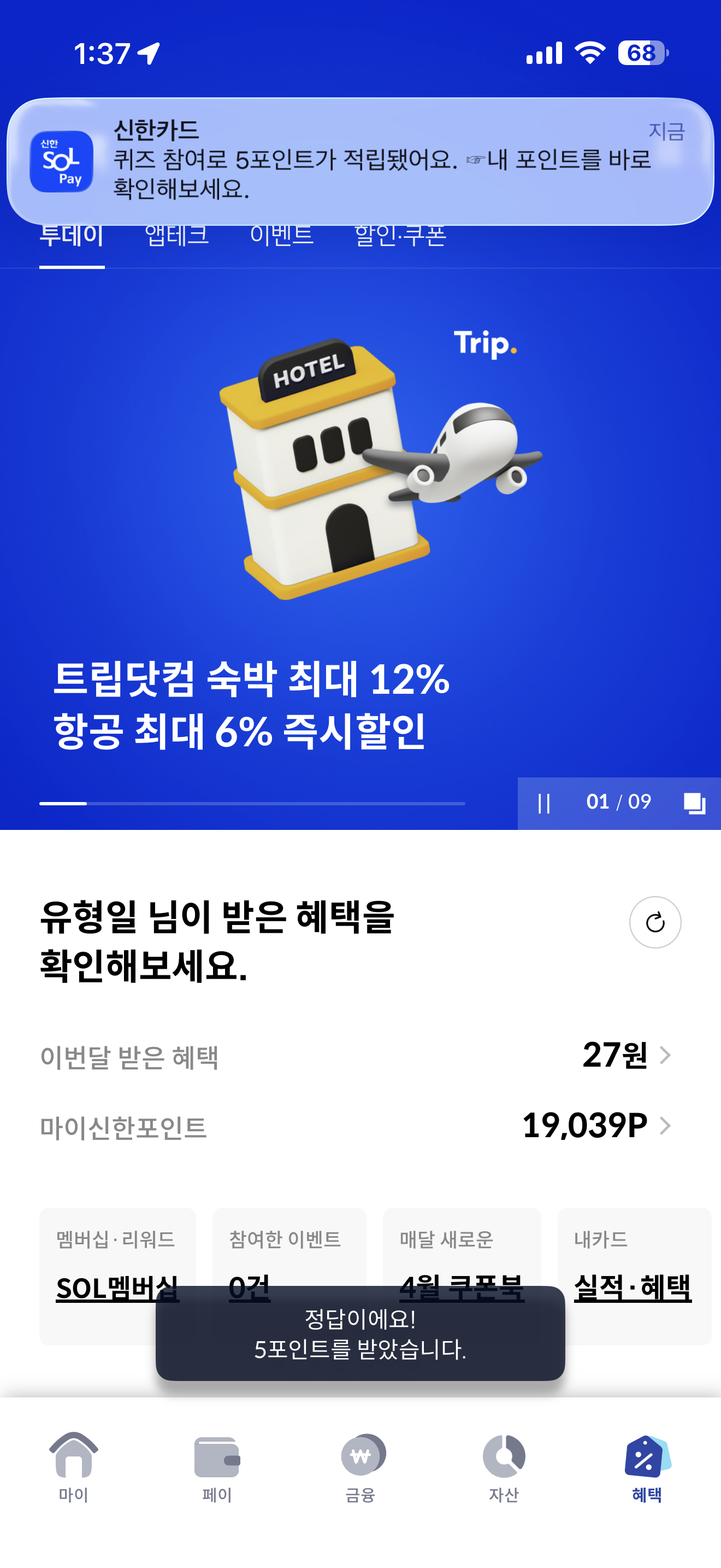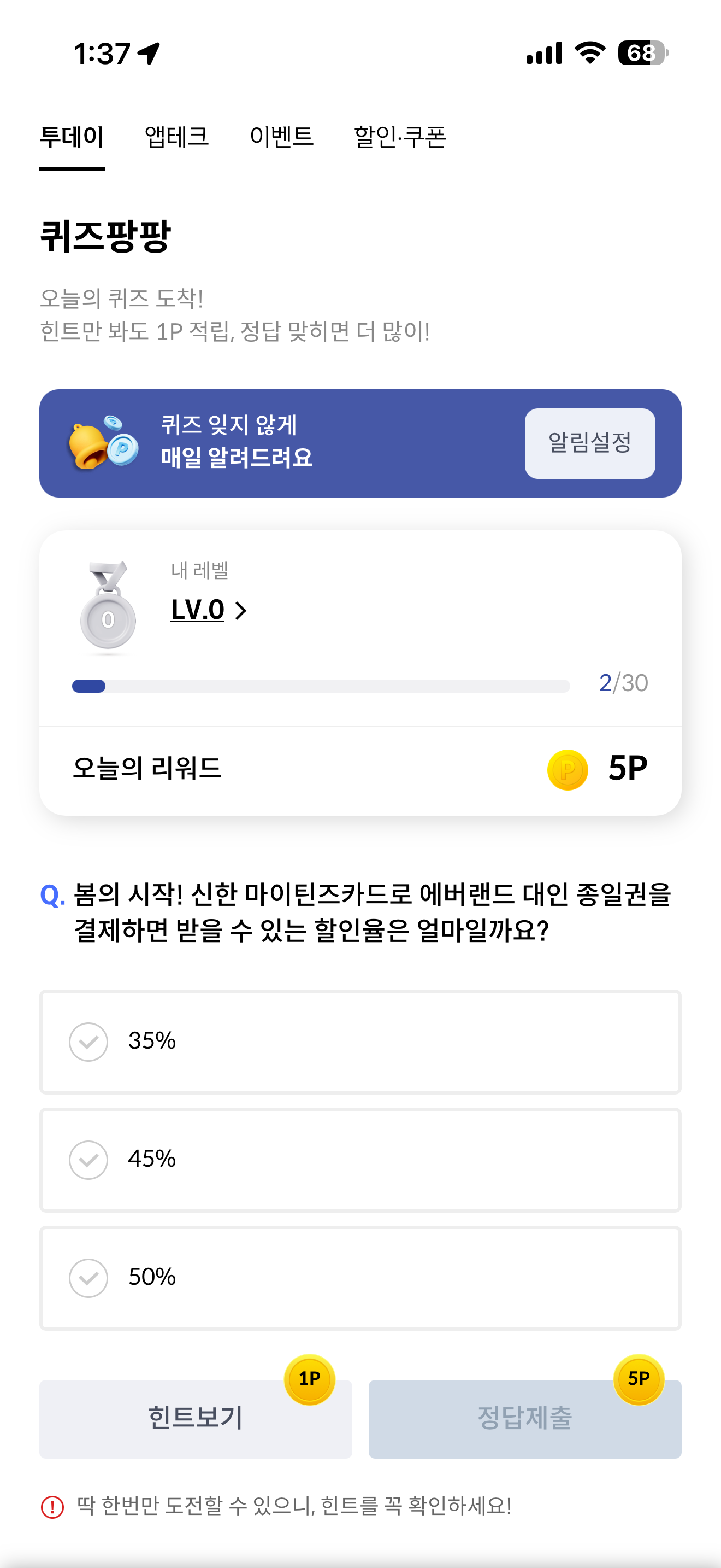신한카드 퀴즈팡팡 정답은 45% 입니다