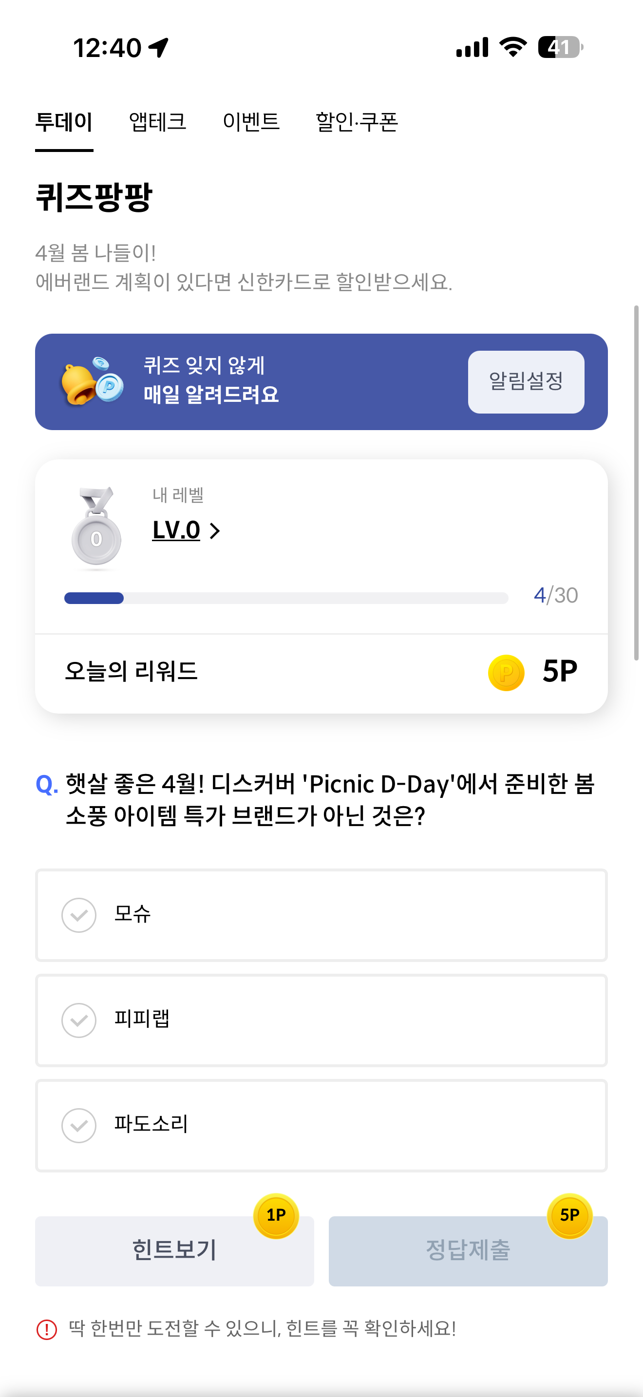 신한카드 퀴즈팡팡 4월 7일 정답(햇살 좋은 4월! 디스커버 'Picnic D-Day'에서 준비한 봄소풍 아이템 특가 브랜드가 아닌 것은?)