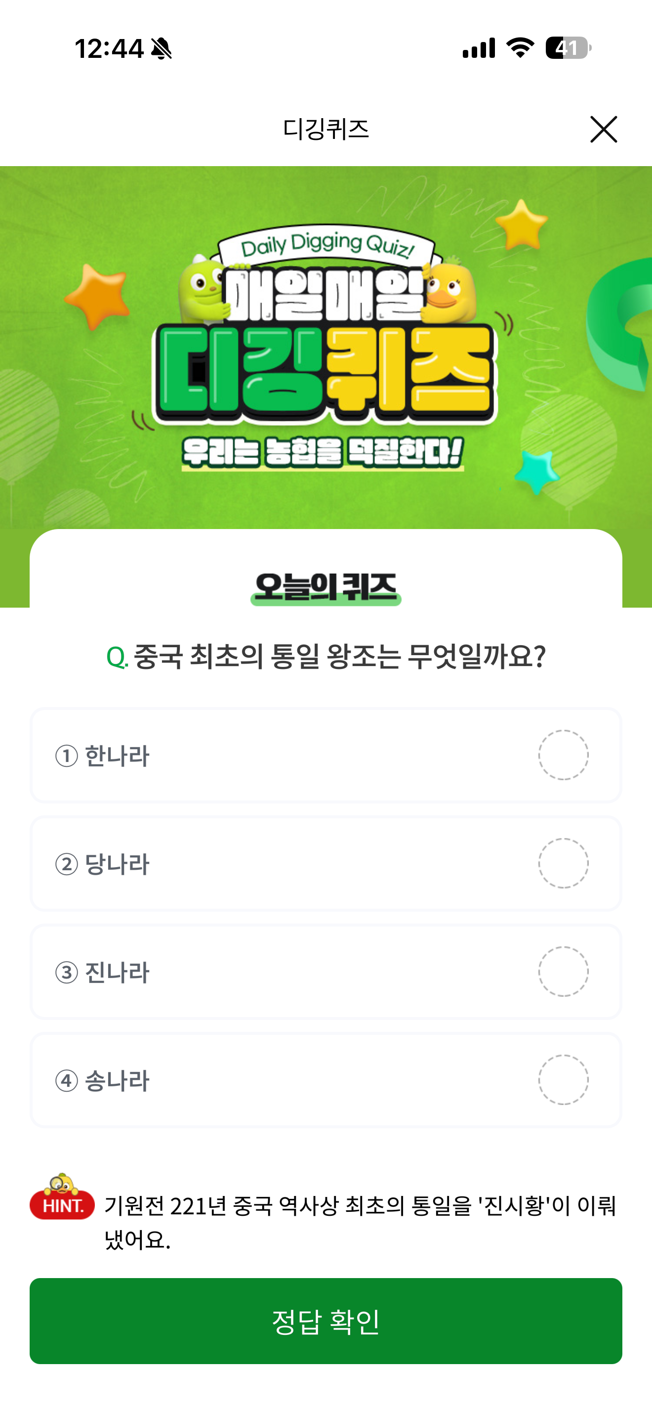 NH올원뱅크 디깅퀴즈 4월 7일 정답(중국 최초의 통일 왕조는 무엇일까요?)