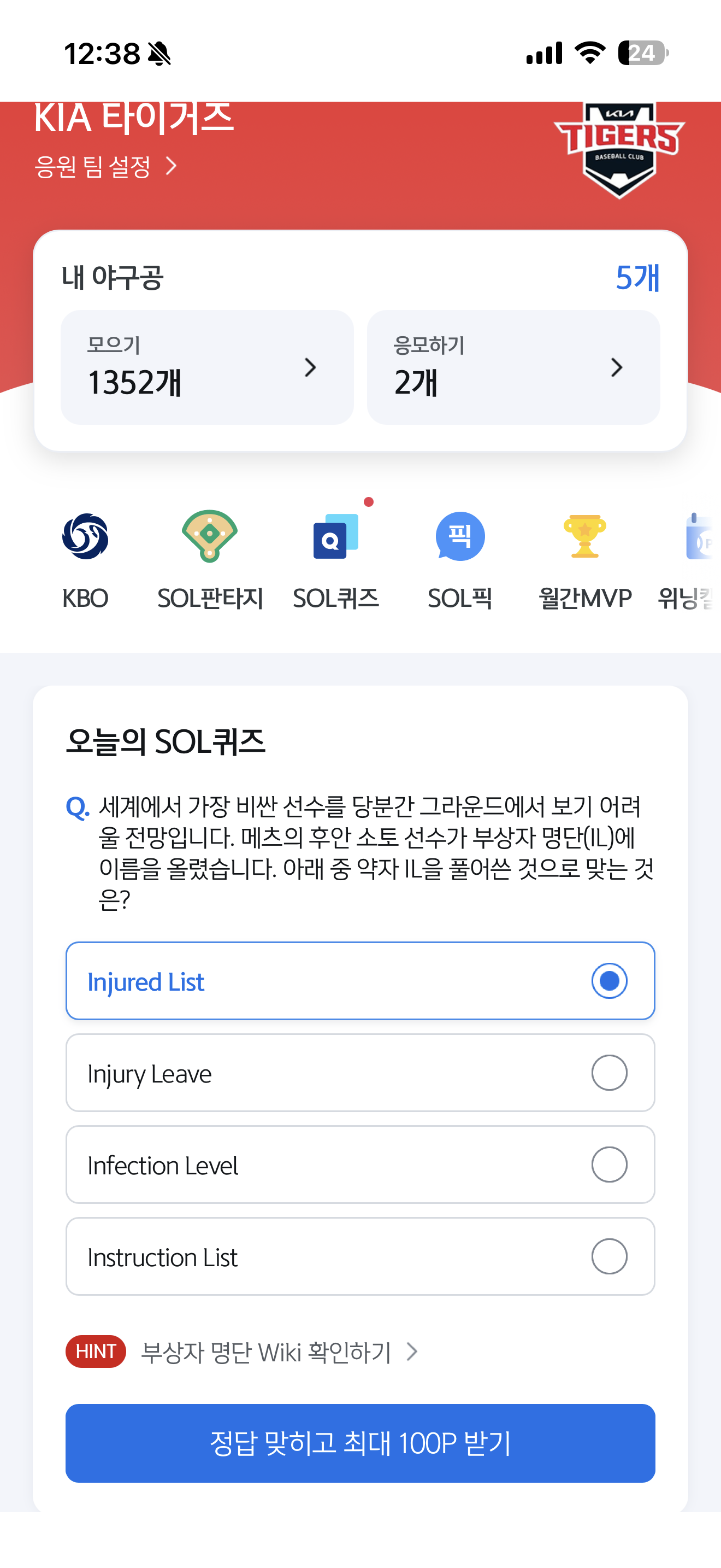신한은행 SOL 야구 쏠퀴즈 정답은 injured List 입니다