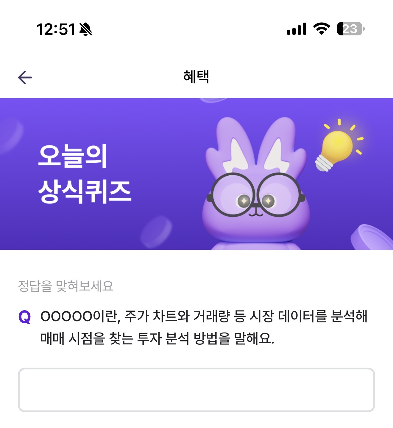 비트버니 오늘의 상식 퀴즈 4월 8일 정답(OOOOO이란, 주가 차트와 거래량 등 시장 데이터를 분석해 매매 시점을 찾는 투자 분석 방법을 말해요)