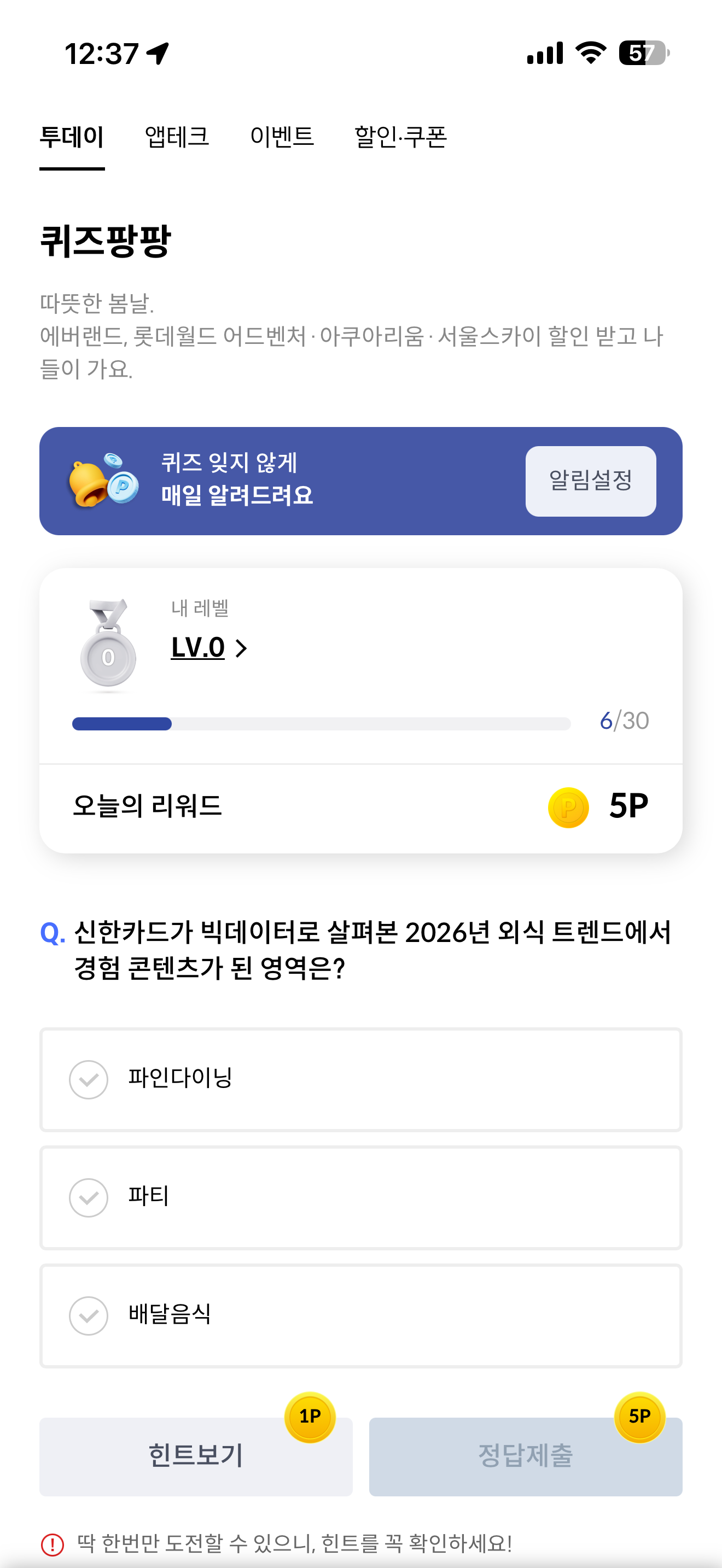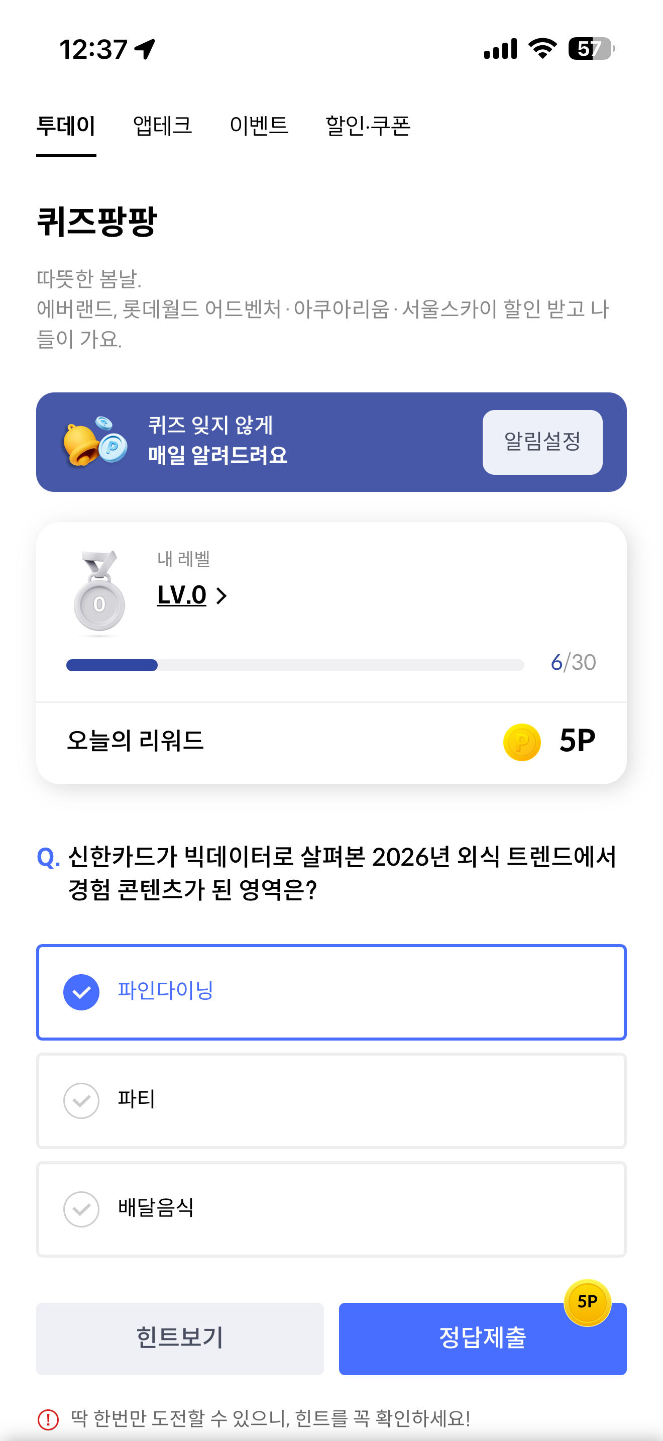 신한카드 퀴즈팡팡 정답은 파인다이닝 입니다