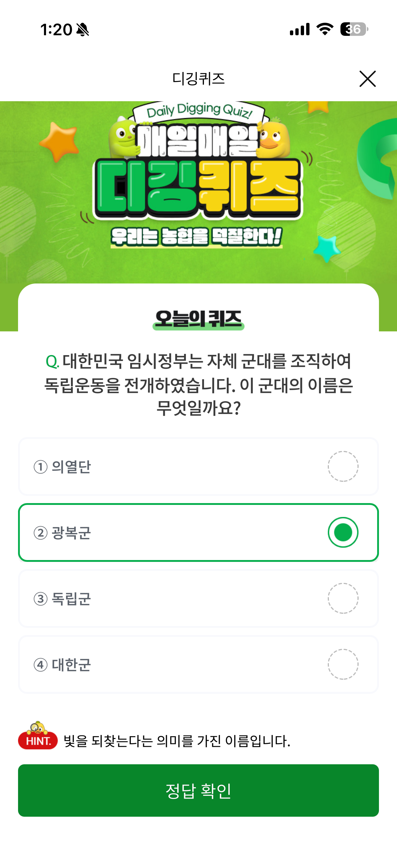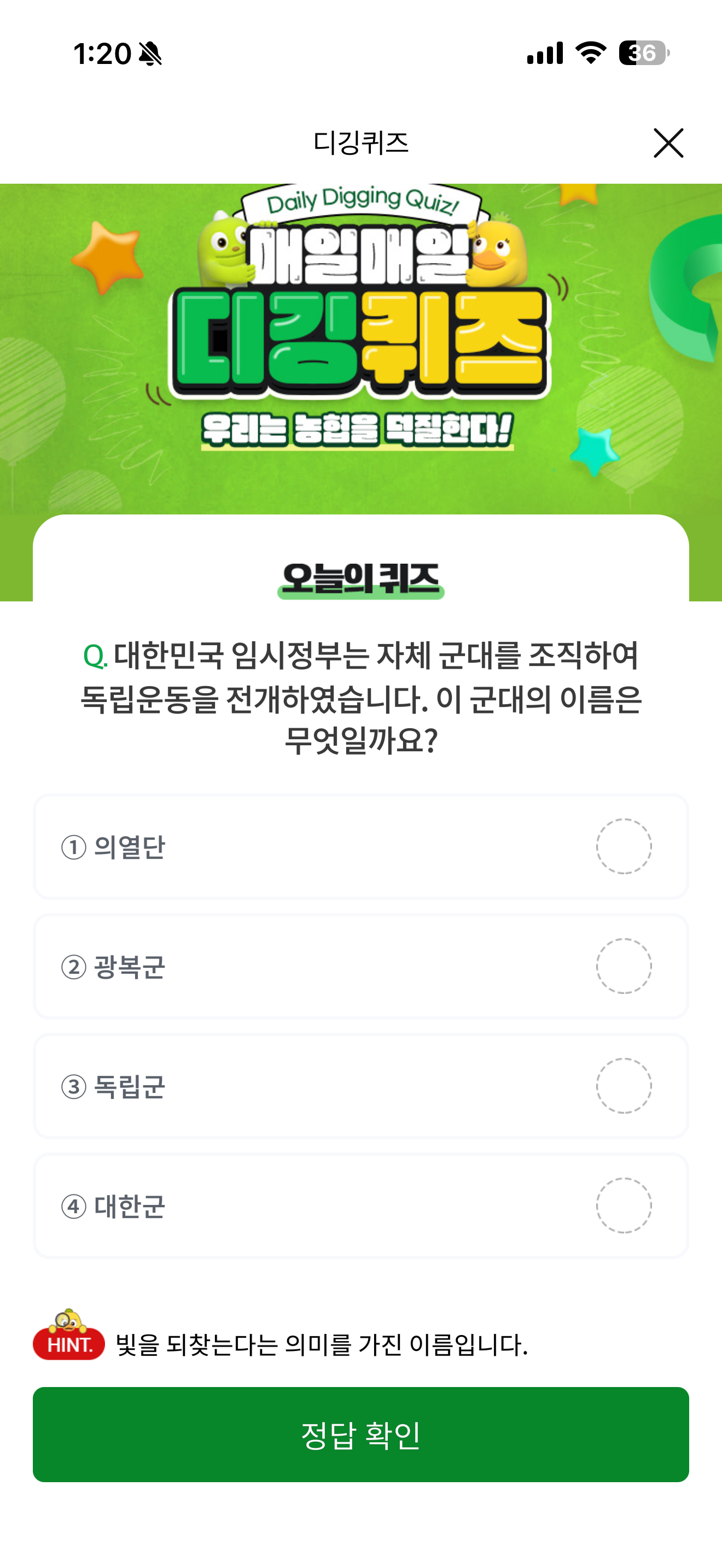 NH올원뱅크 디깅퀴즈 4월 10일 정답(대한민국 임시정부는 자체 군대를 조직하여 독립운동을 전개하였습니다. 이 군대의 이름은 무엇일까요?)
