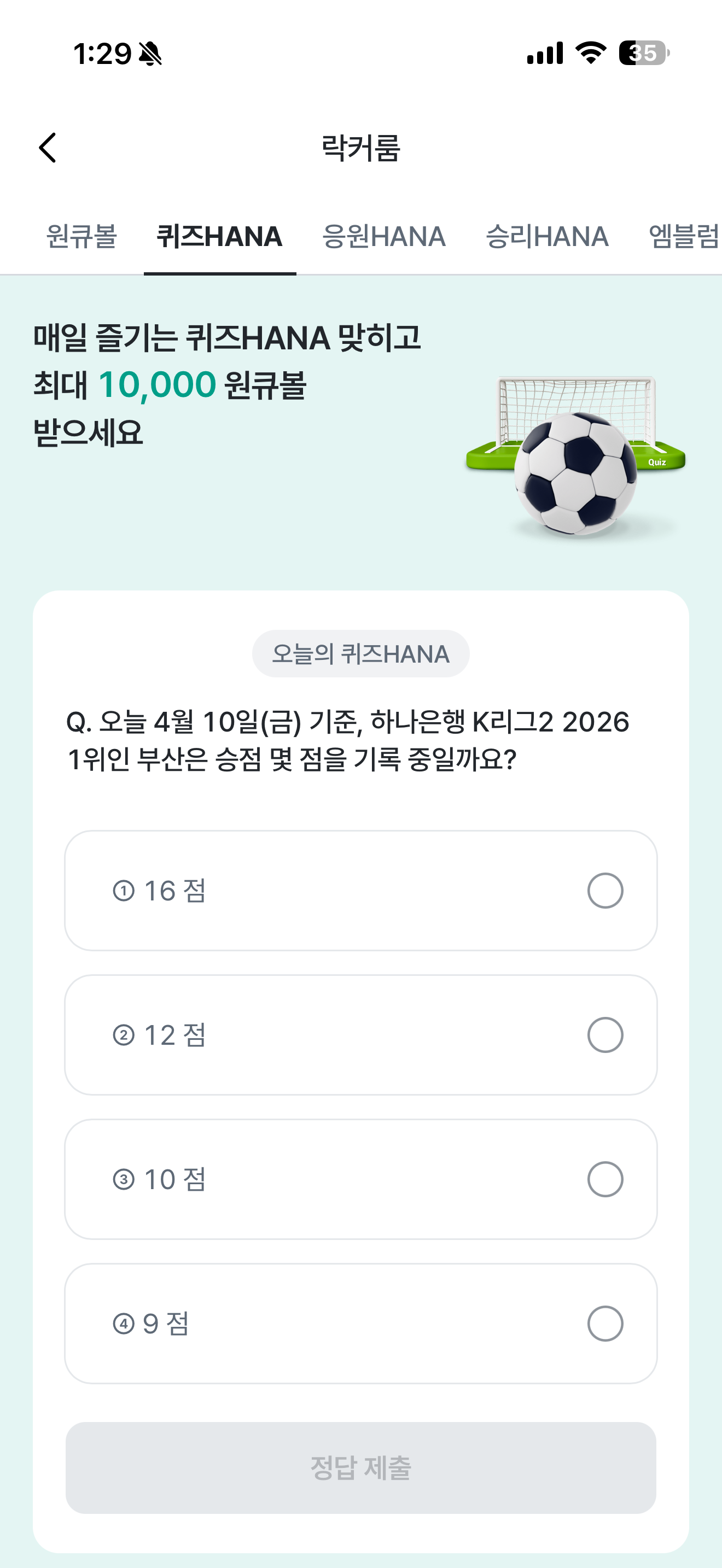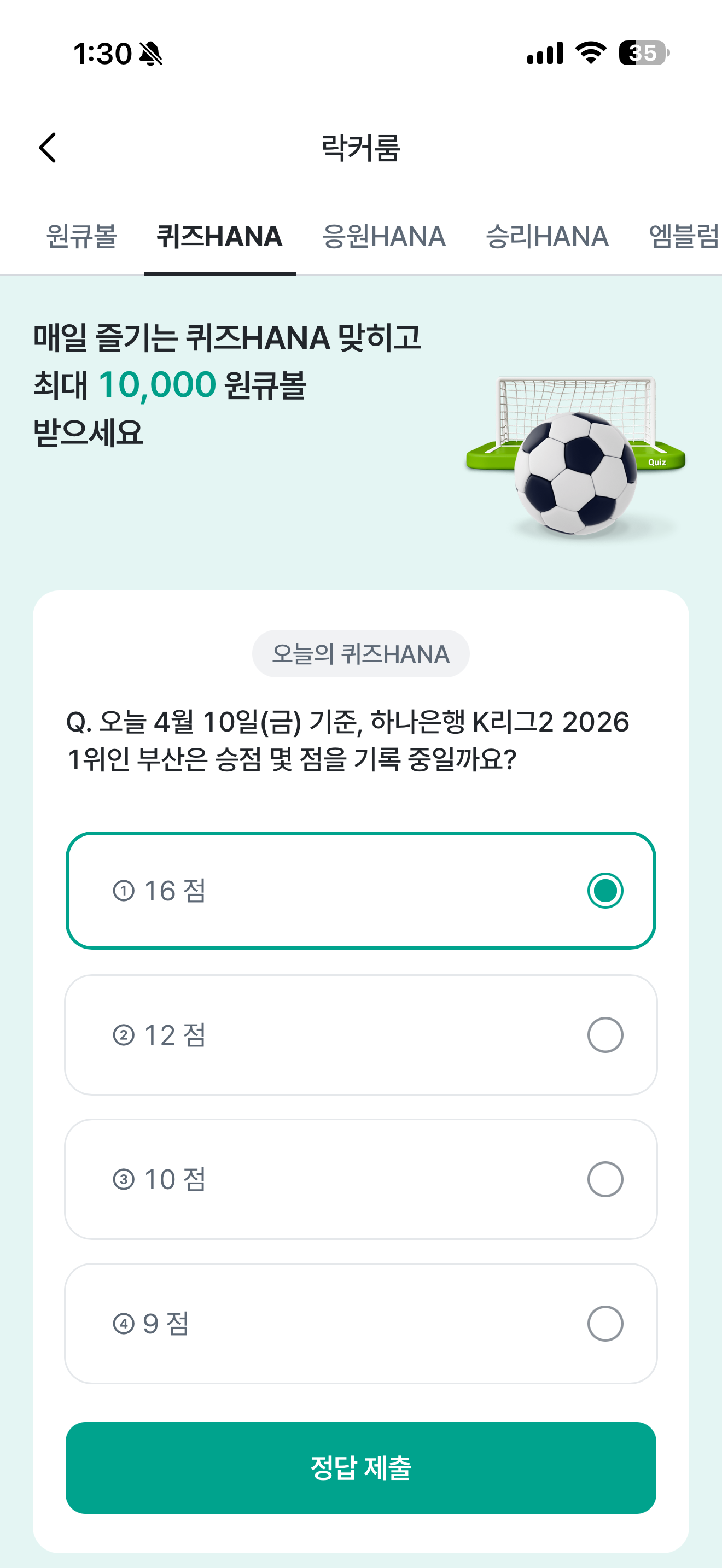 하나원큐 축구 play 퀴즈 HANA 정답은 16점 입니다