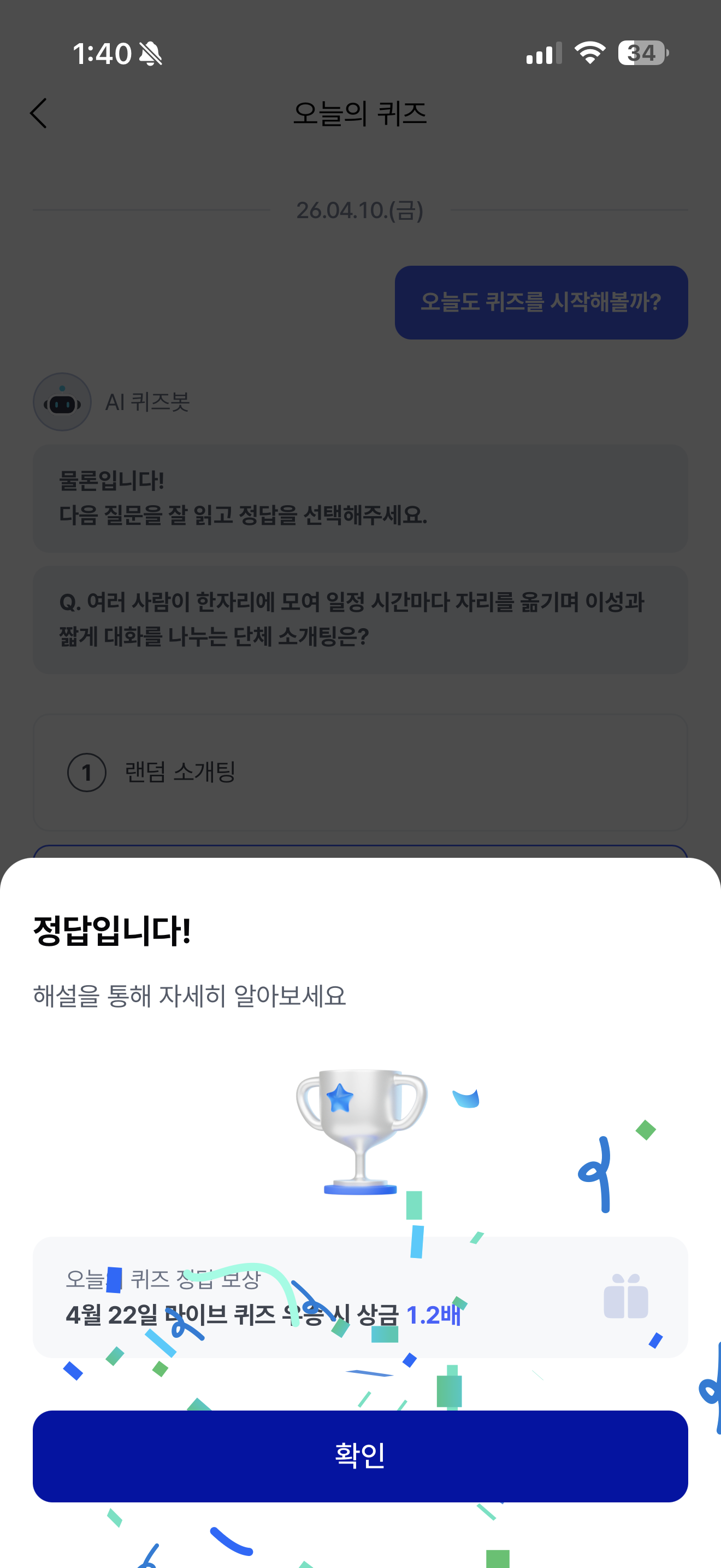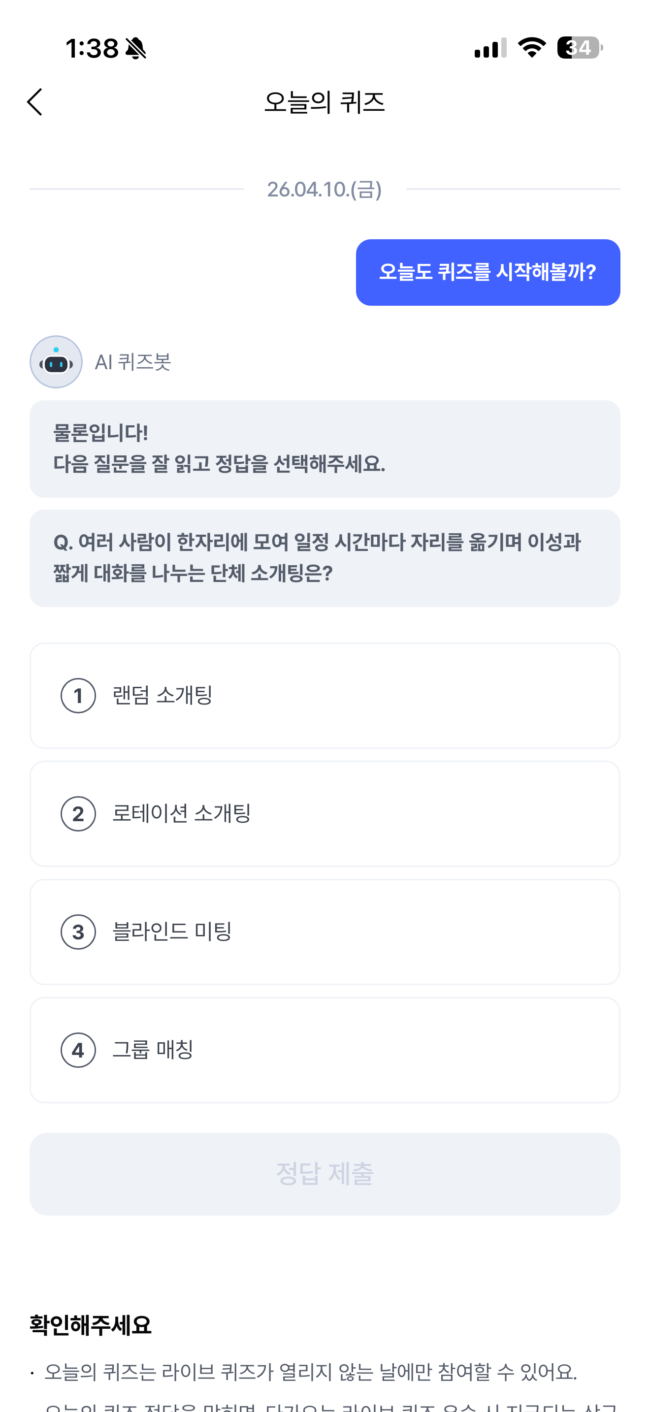 케이뱅크 AI 퀴즈 챌린지 정답은 로테이션 소개팅 입니다