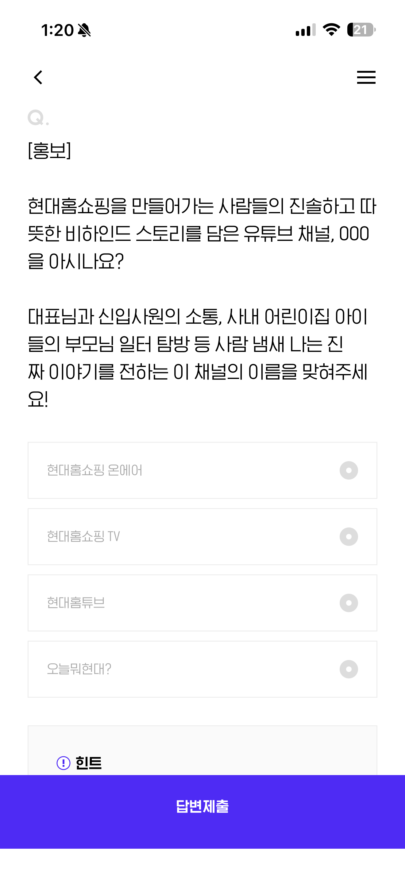 현대홈쇼핑을 만들어가는 사람들의 진솔하고 따뜻한 비하인드 스토리를 담은 유튜브 채널, 000을 아시나요? 대표님과 신입사원의 소통, 사내 어린이집 아이들의 부모님 일터 탐방 등 사람 냄새 나는 진짜 이야기를 전하는 이 채널의 이름을 맞혀주세요! 보기는 1. 현대홈쇼핑 온에어 2. 현대홈쇼핑 TV 3. 현대홈튜브 4. 오늘뭐현대