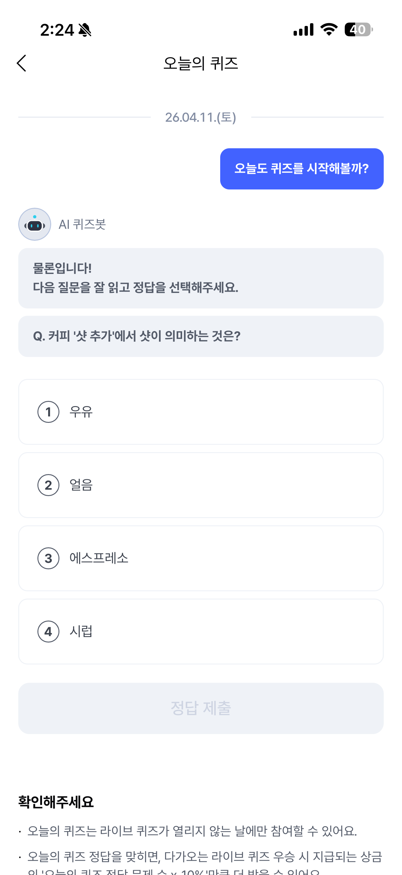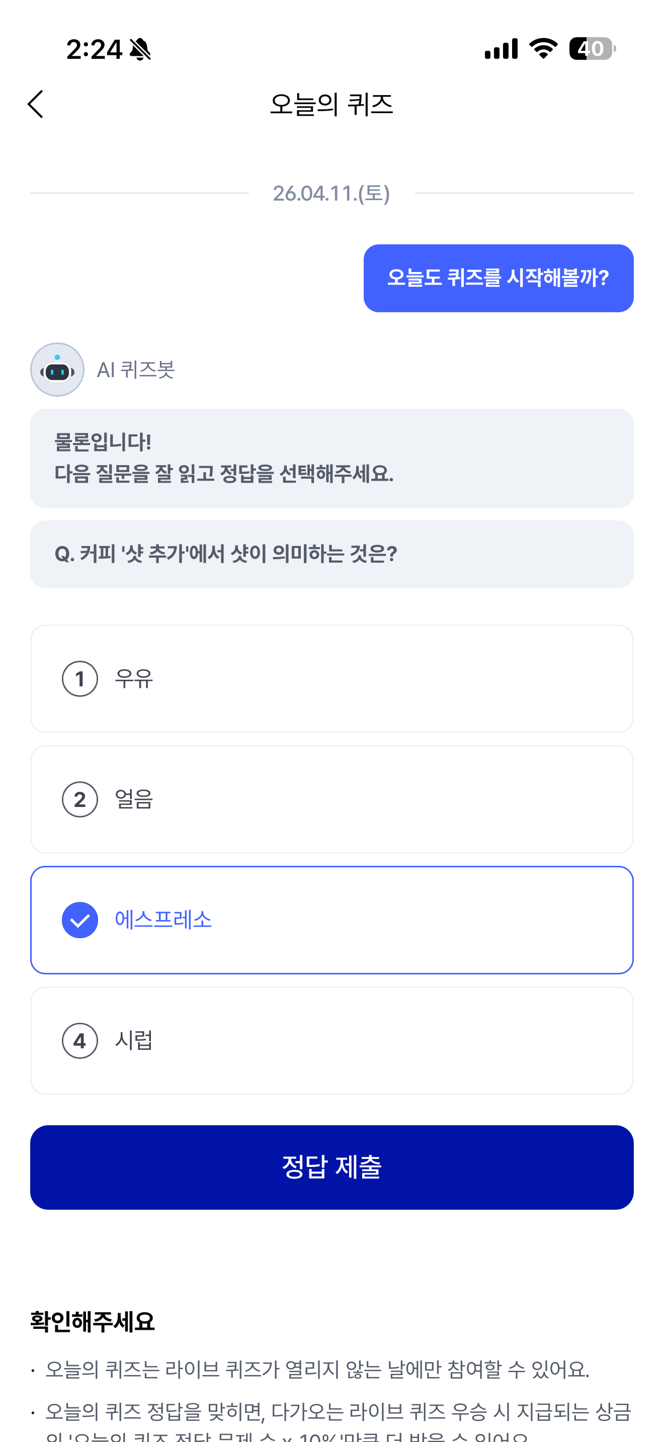 케이뱅크 AI 퀴즈 챌린지 4월 11일 정답(커피 '샷 추가'에서 샷이 의미하는 것은?)