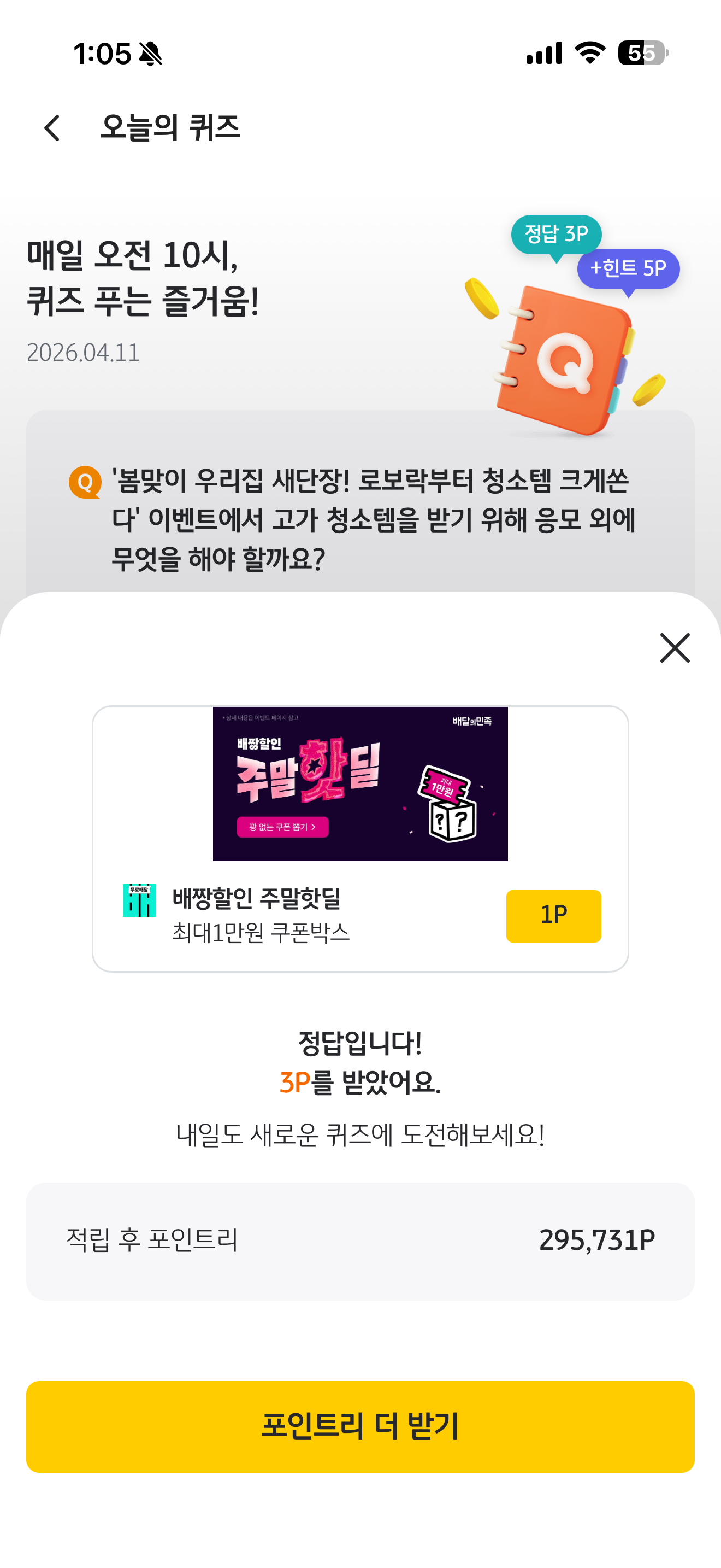 '봄맞이 우리집 새단장! 로보락부터 청소템 크게쏜다' 이벤트에서 고가 청소템을 받기 위해 응모 외에 무엇을 해야 할까요? 보기는 1. 오늘의웹툰 보기 2. 출석체크 3. 마케팅동의(이벤트/혜택Push, 마케팅수신동의)