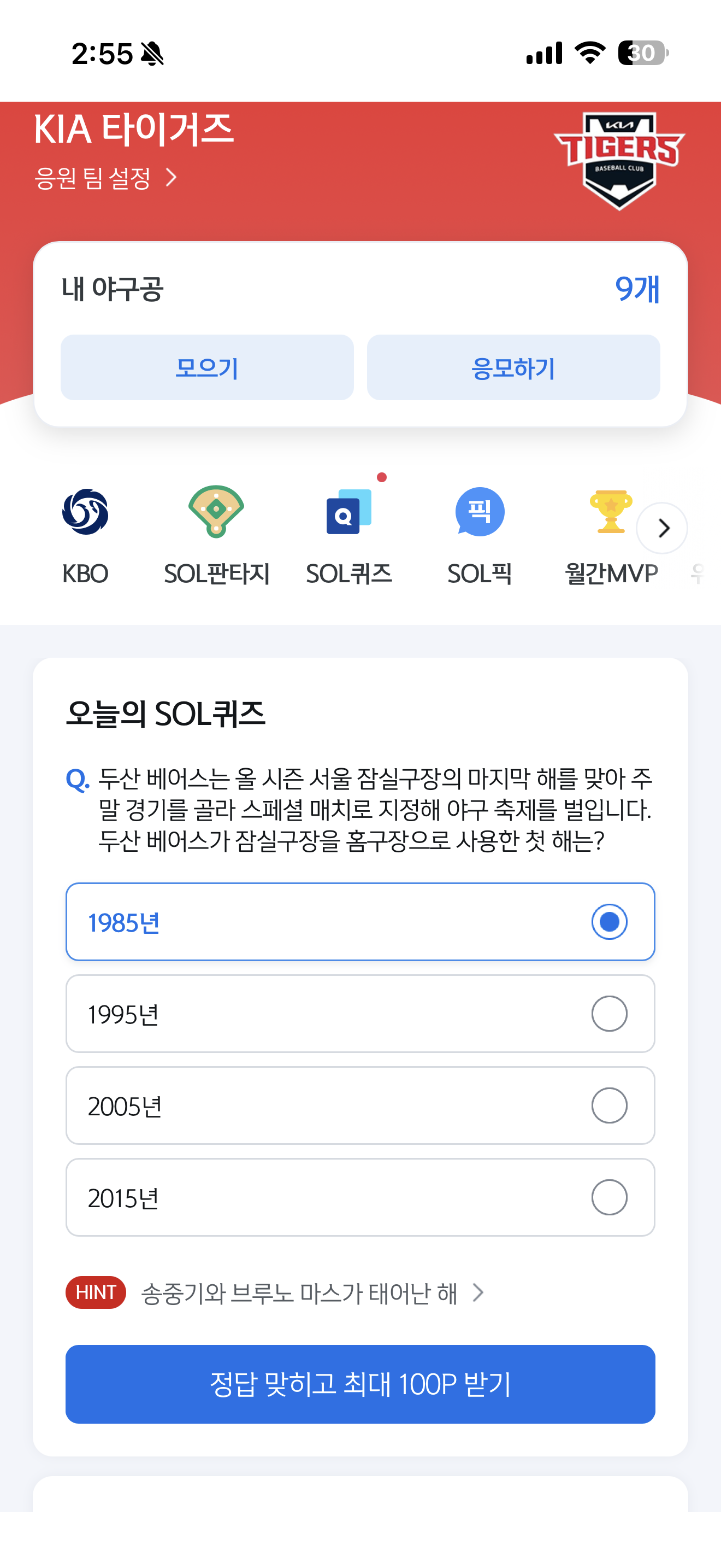 신한은행 SOL 야구 쏠퀴즈 정답은 1985년 입니다