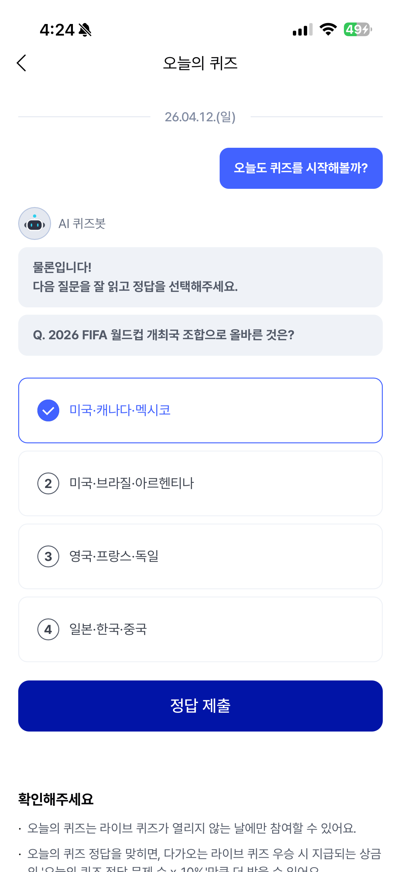 케이뱅크 AI 퀴즈 챌린지 4월 12일 정답(2026 FIFA 월드컵 개최국 조합으로 올바른 것은?)