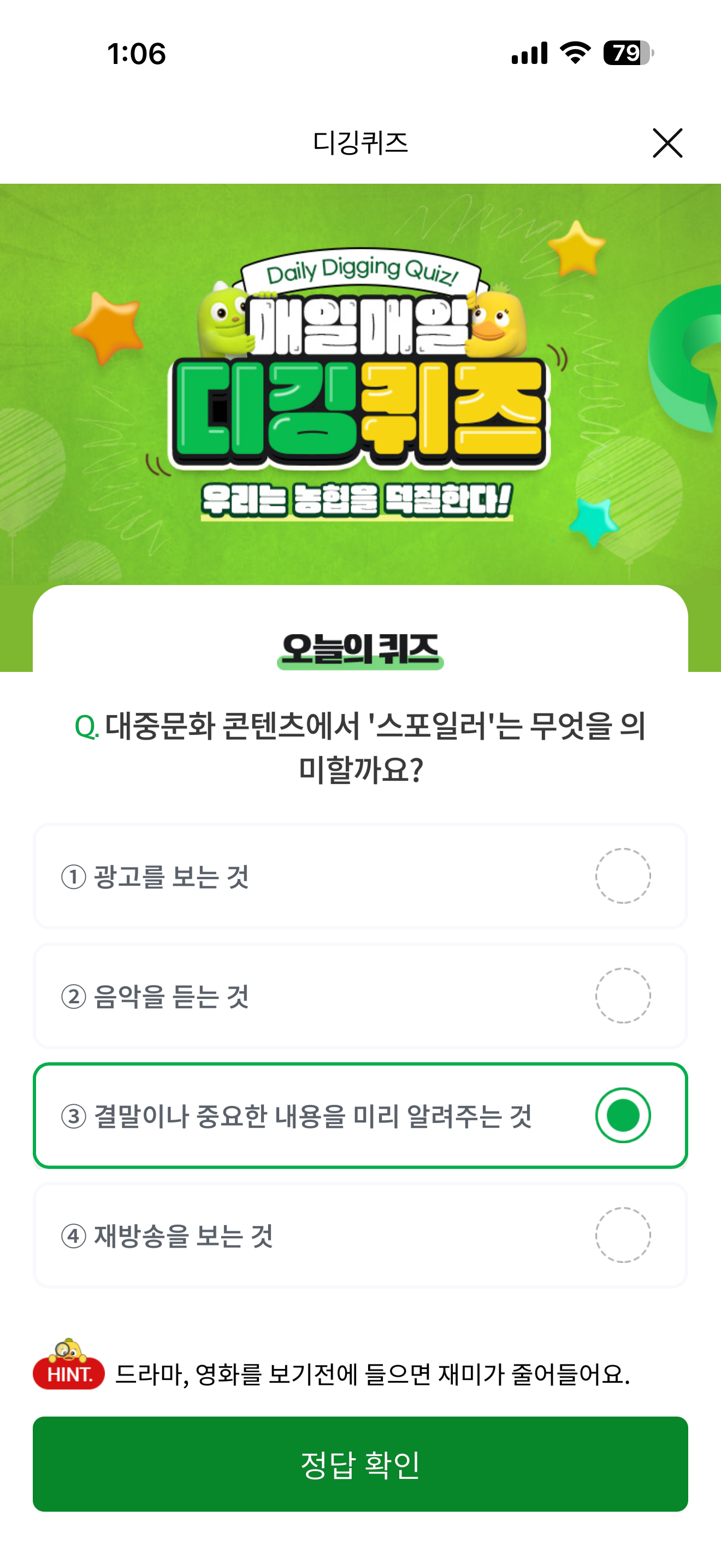 NH올원뱅크 디깅퀴즈 정답은 결말이나 중요한 내용을 미리 알려주는 것 입니다