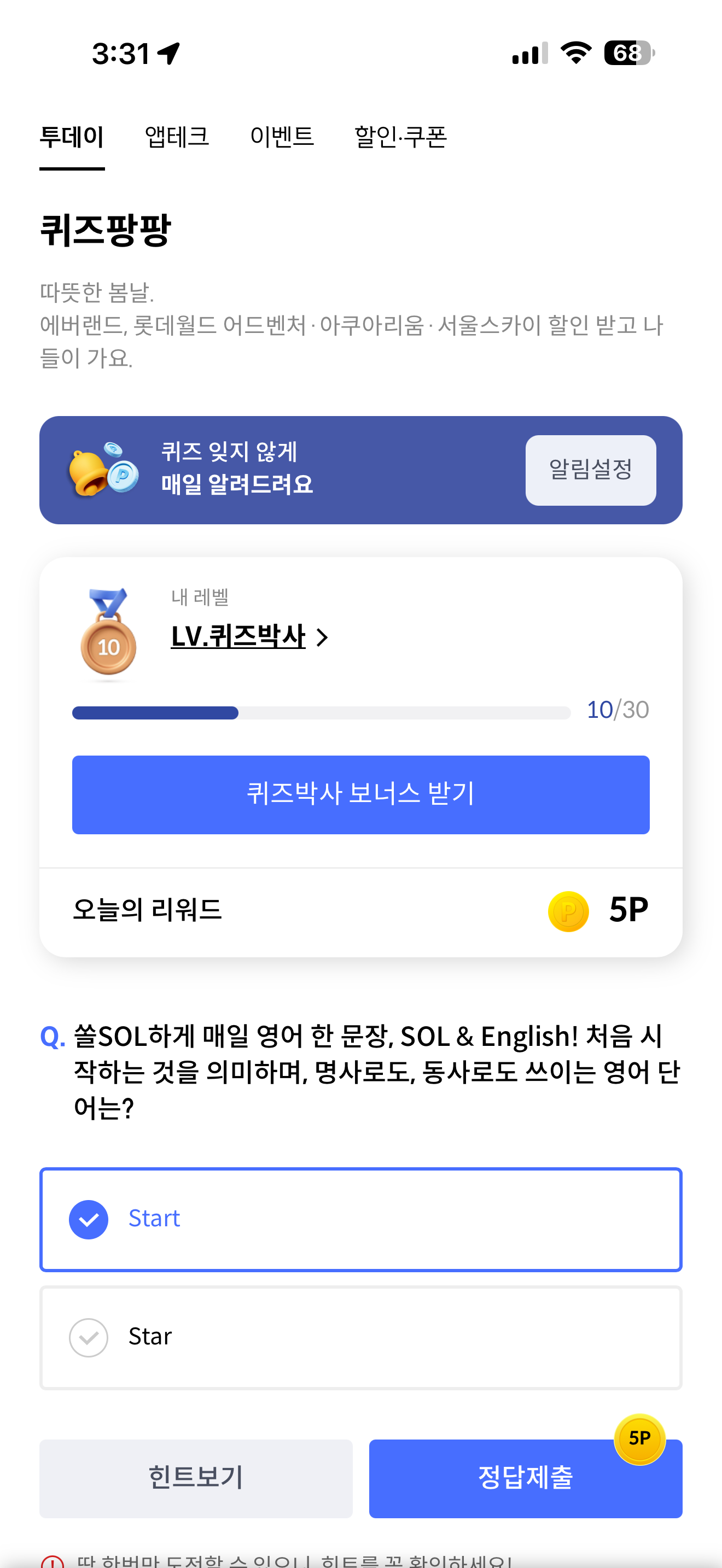 신한카드 퀴즈팡팡 4월 13일 정답(쏠SOL하게 매일 영어 한 문장, SOL & English! 처음 시작하는 것을 의미하며, 명사로도, 동사로도 쓰이는 영어 단어는?)