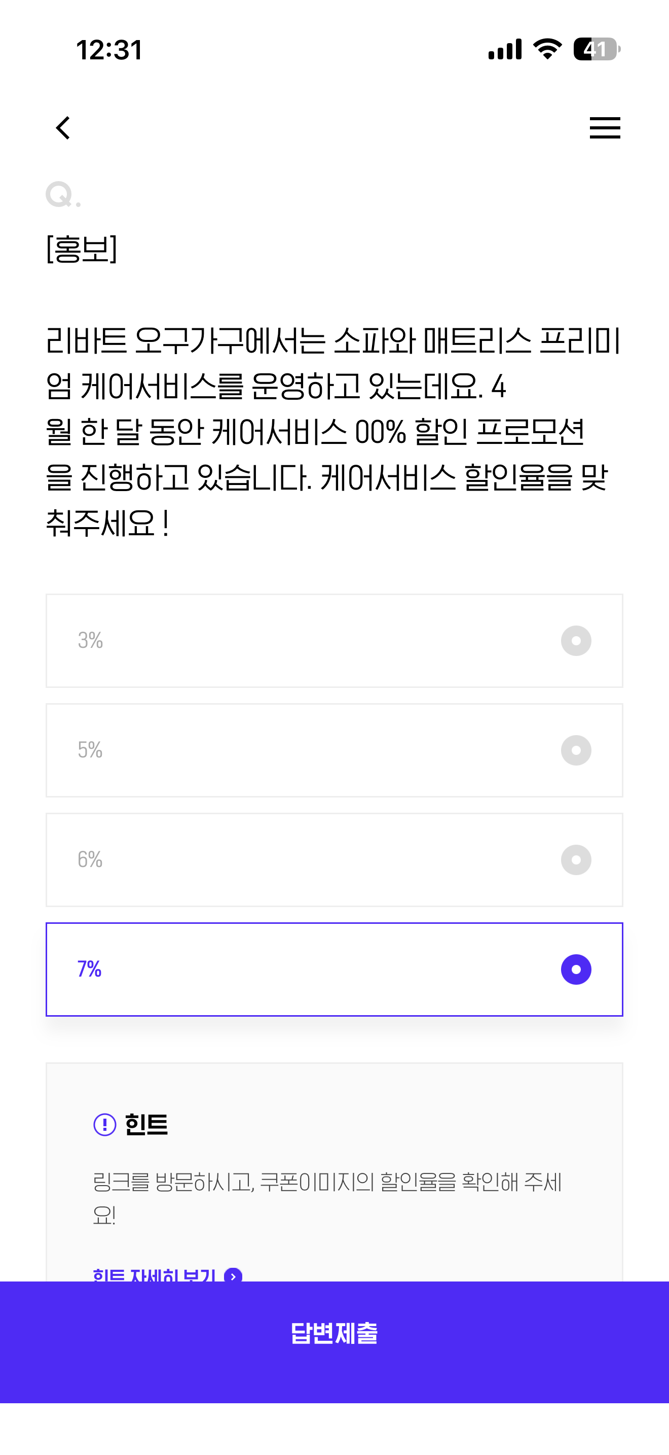 리바트 오구가구에서는 소파와 매트리스 프리미엄 케어서비스를 운영하고 있는데요. 4월 한 달 동안 케어서비스 00% 할인 프로모션을 진행하고 있습니다. 케어서비스 할인율을 맞춰주세요! 보기는 1. 3% 2. 5% 3. 6% 4. 7% 입니다