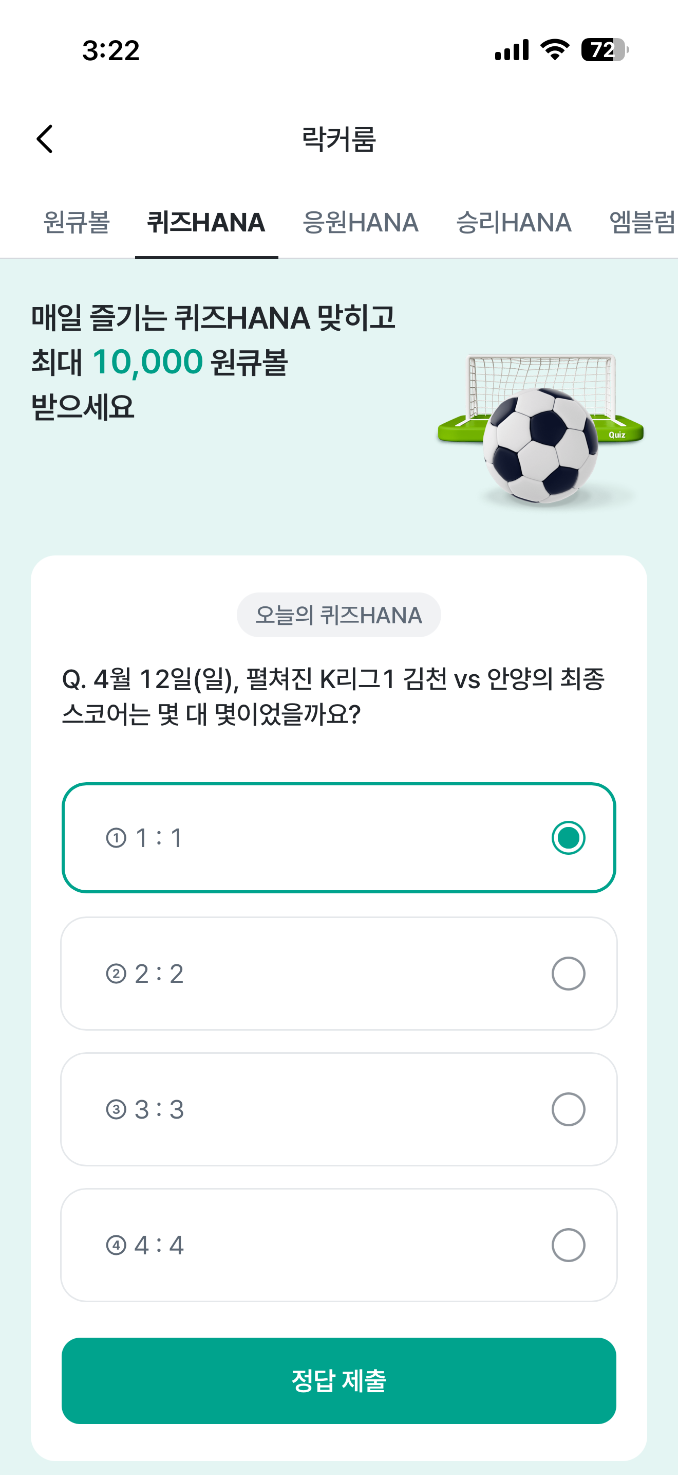 하나원큐 축구 play 퀴즈 HANA 정답은 1:1 입니다
