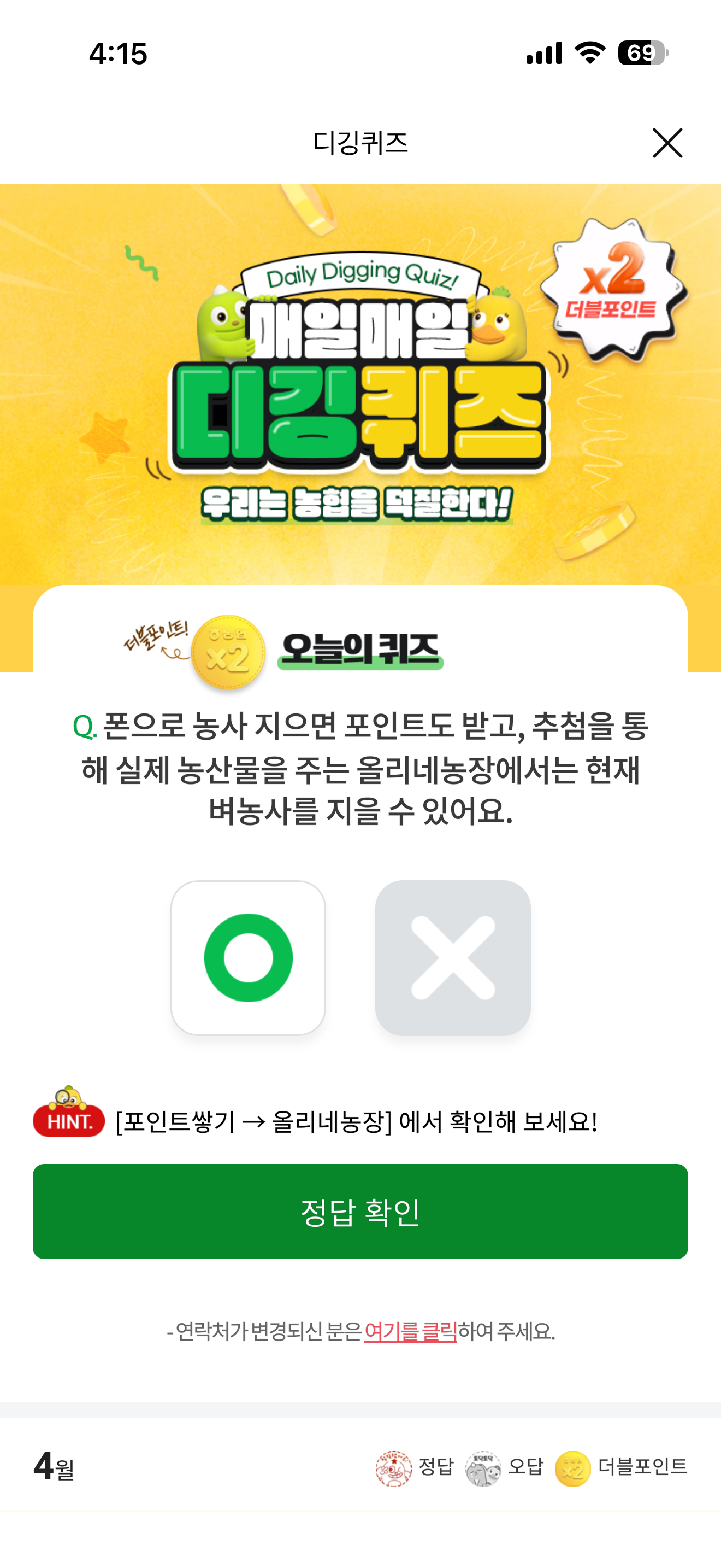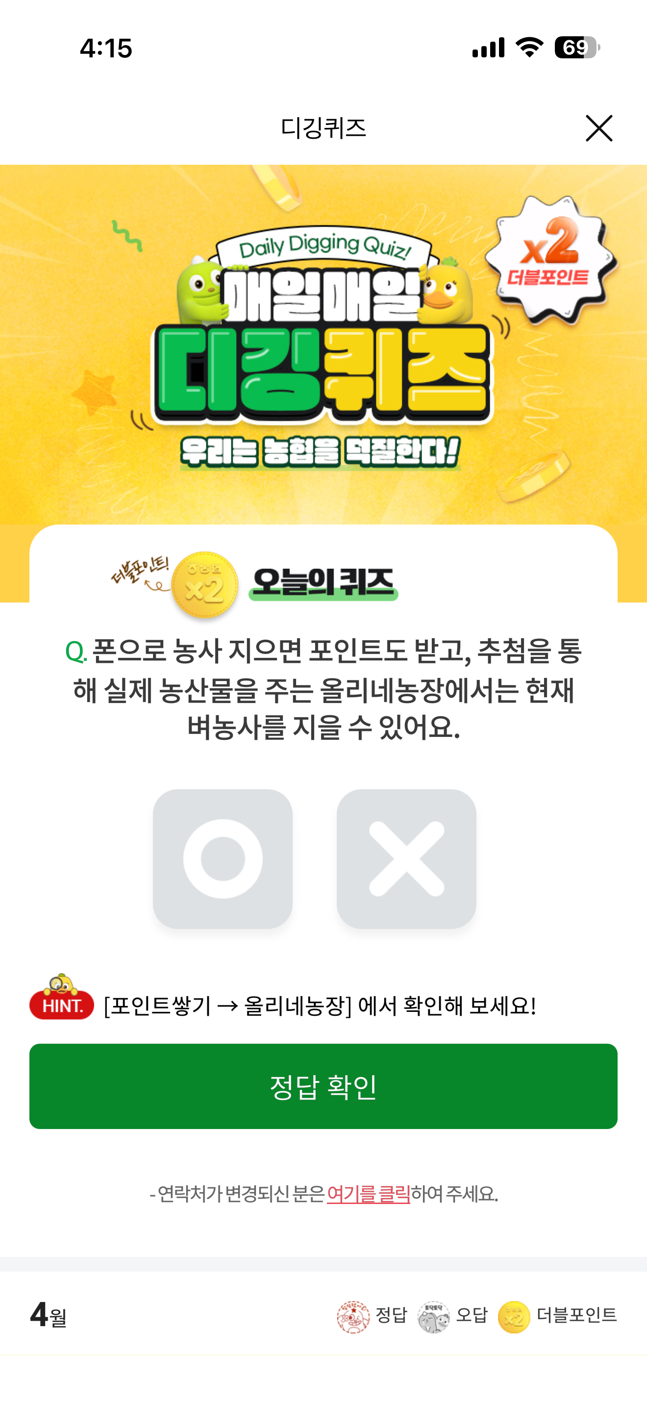 폰으로 농사 지으면 포인트도 받고, 추첨을 통해 실제 농산물을 주는 올리네농장에서는 현재 벼농사를 지을 수 있어요 O, X 퀴즈인데요.