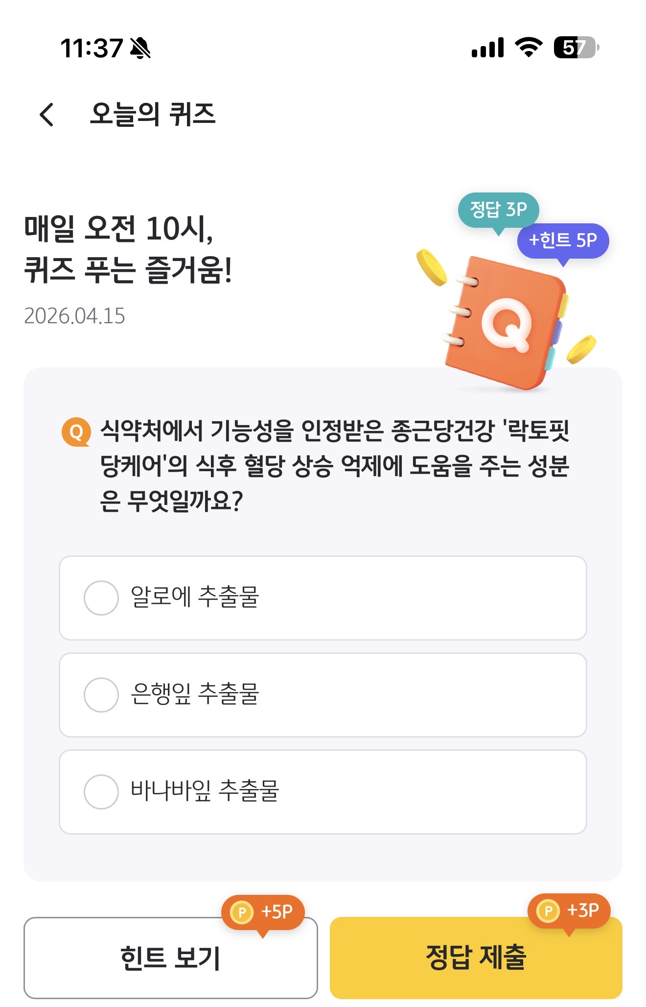 KB Pay 오늘의 퀴즈 4월 15일 정답(식약처에서 기능성을 인정받은 종근당건강 '락토핏당케어'의 식후 혈당 상승 억제에 도움을 주는 성분은 무엇일까요?)