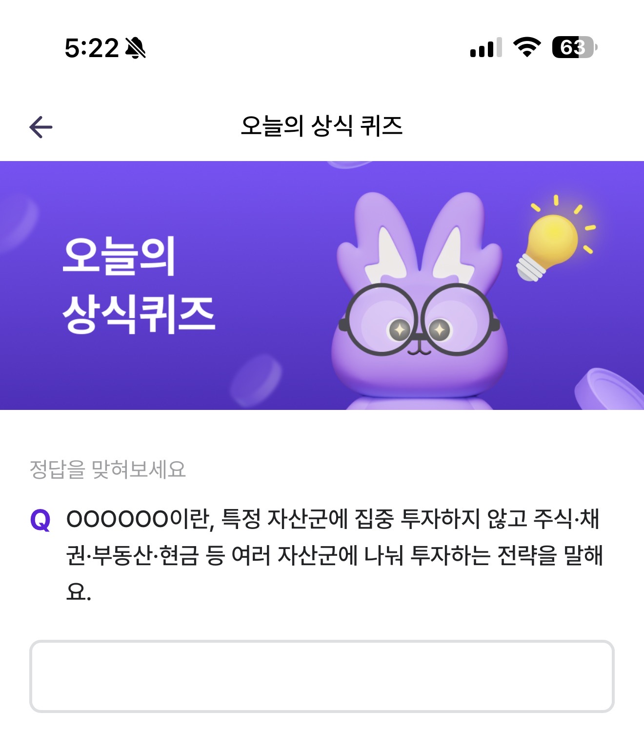 OOOOOO이란, 특정 자산군에 집중 투자하지 않고 주식 채권 부동산 현금 등 여러 자산군에 나눠 투자하는 전략을 말해요. 주관식 퀴즈인데요.