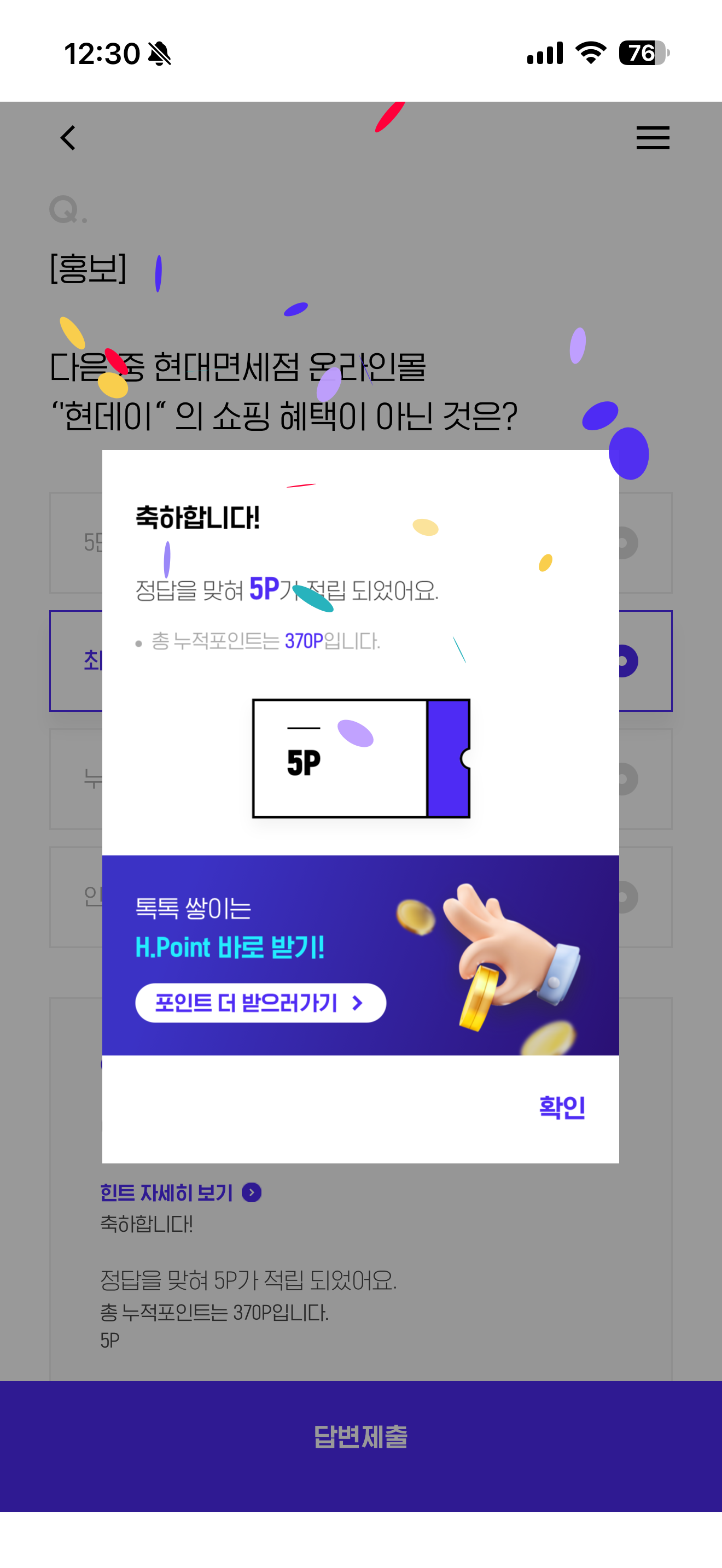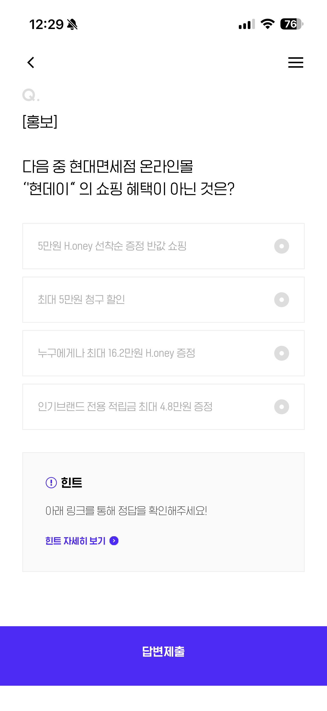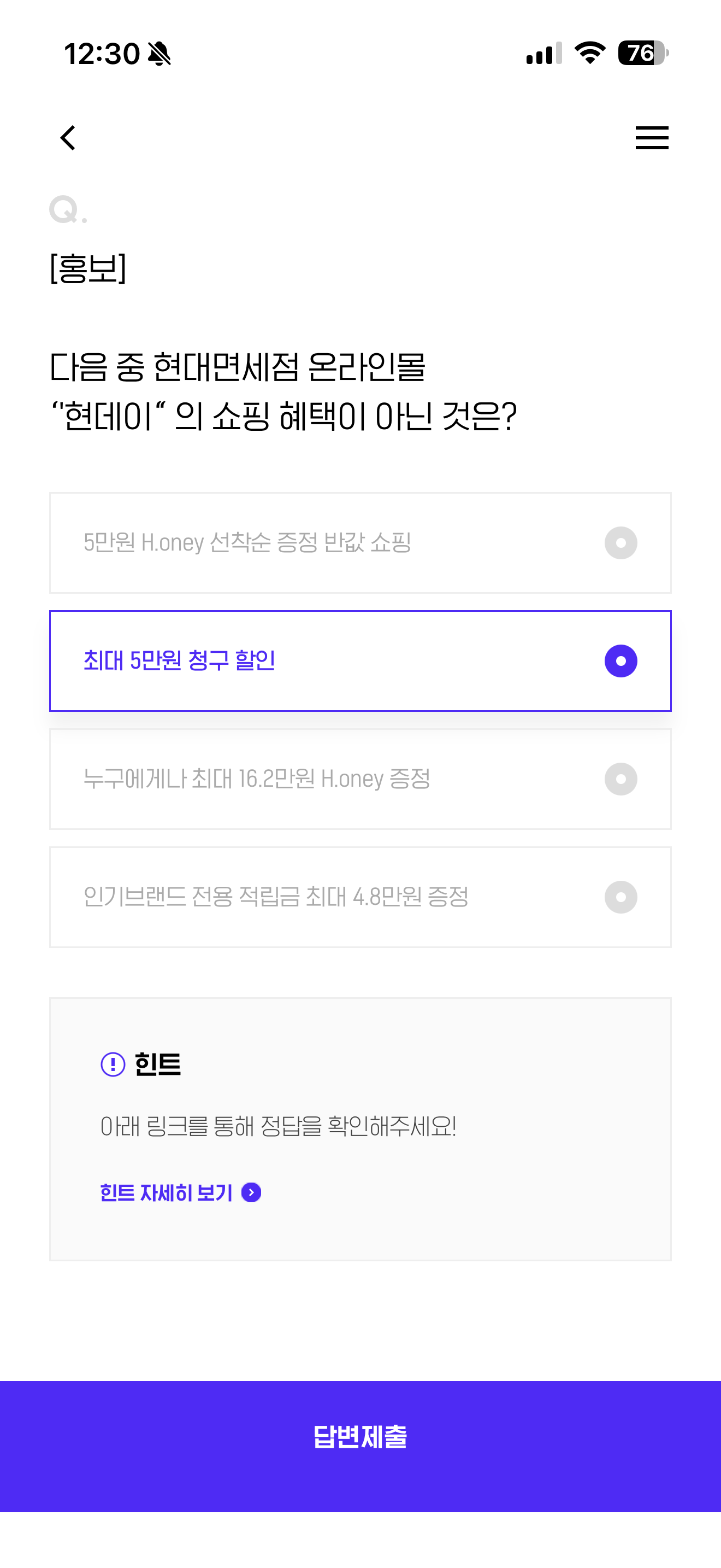 H포인트 퀴즈 정답은 최대 5만원 청구 할인 입니다