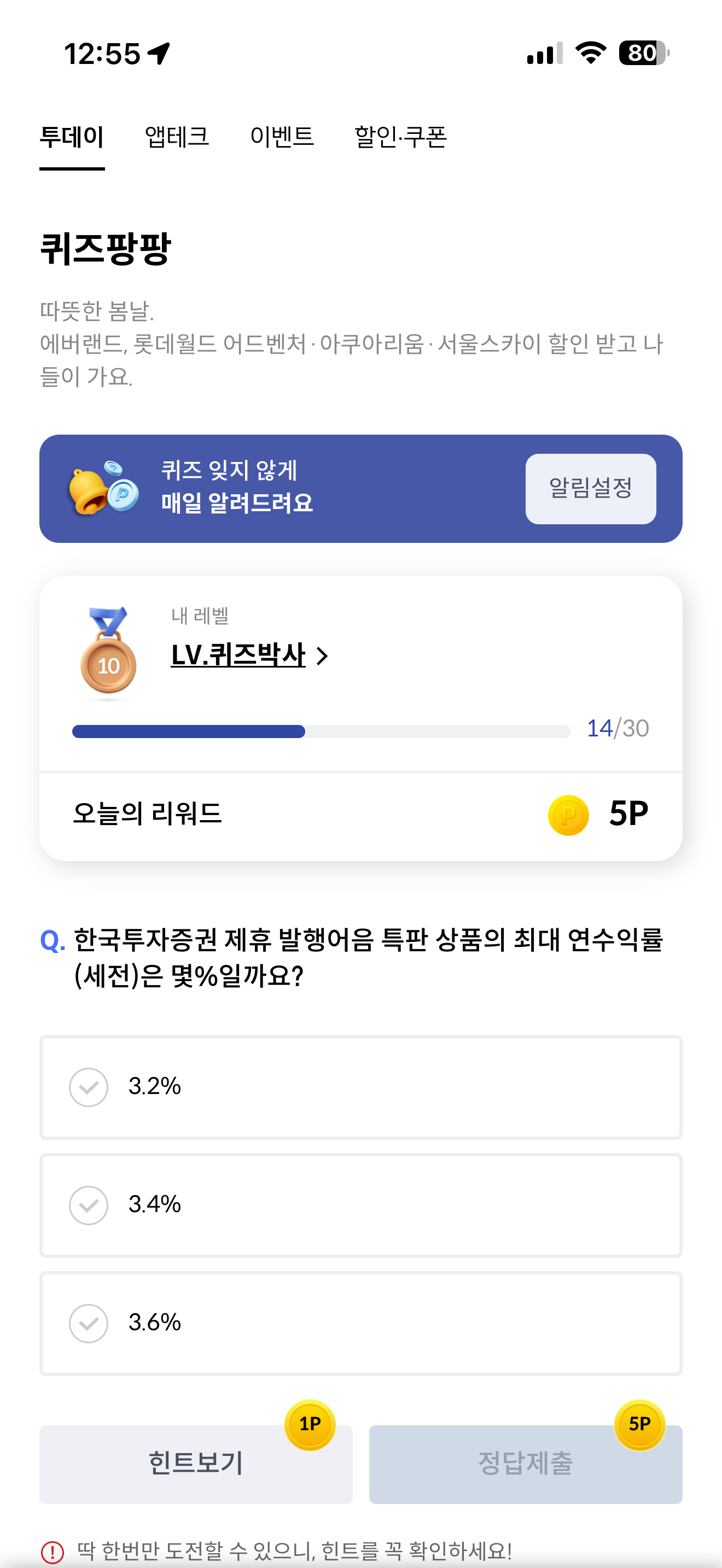 신한카드 퀴즈팡팡 4월 17일 정답(한국투자증권 제휴 발행어음 특판 상품의 최대 연수익률(세전)은 몇%일까요?)