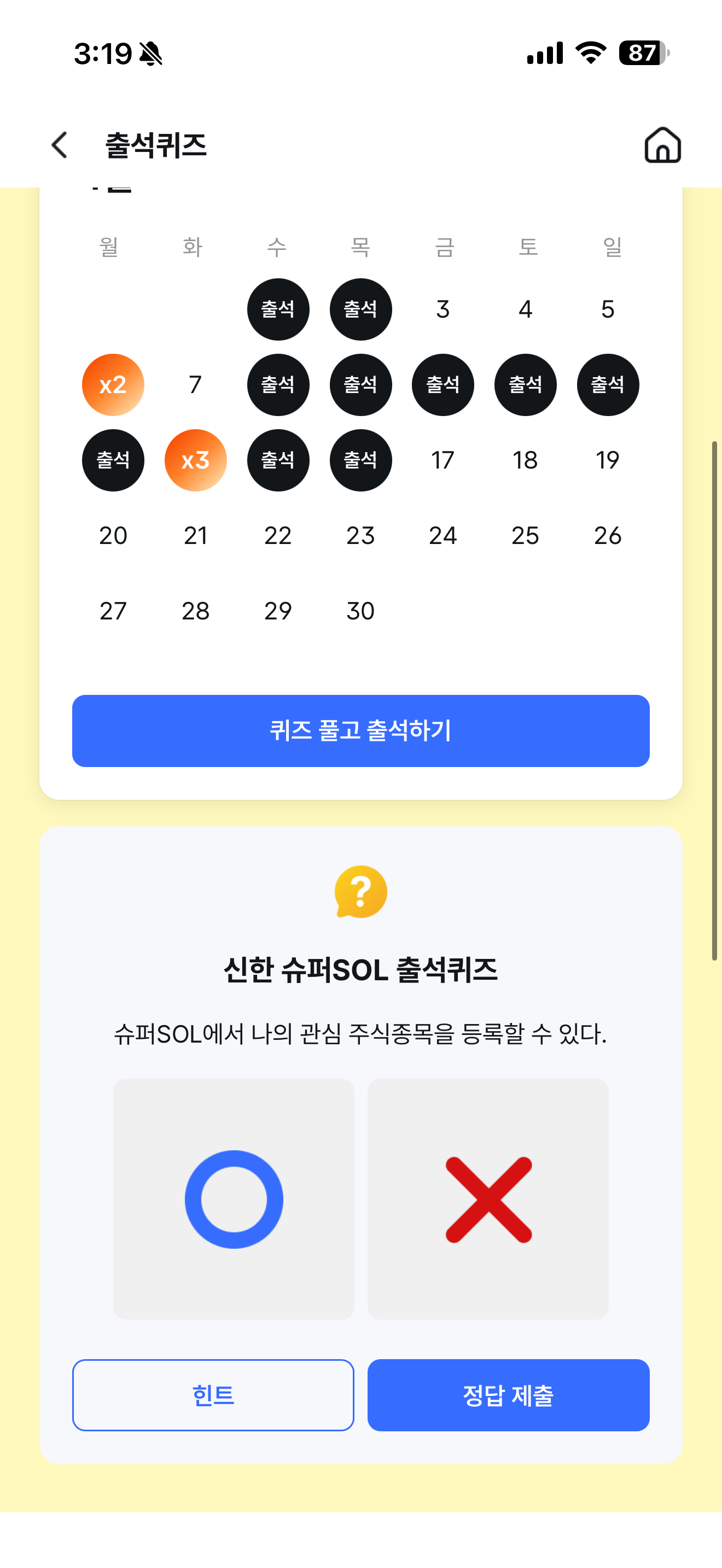 신한 슈퍼SOL 출석퀴즈 정답은 O 입니다