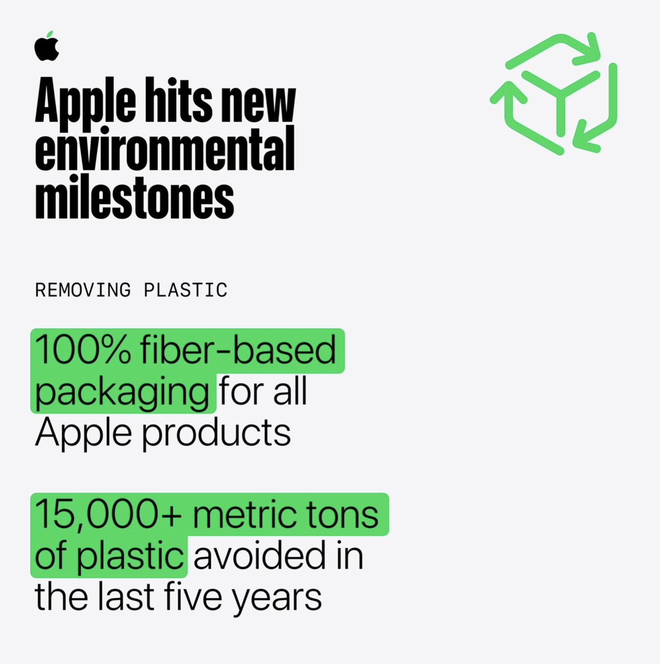 소비자들이 가장 직접적으로 느끼는 변화는 포장입니다. 애플은 이미 모든 제품의 포장을 100% 섬유 기반으로 전환하며 플라스틱을 완전히 없앴습니다. 덕분에 지난 몇 년 동안 플라스틱 병 약 5억 개에 해당하는 플라스틱 사용량을 줄일 수 있었습니다.