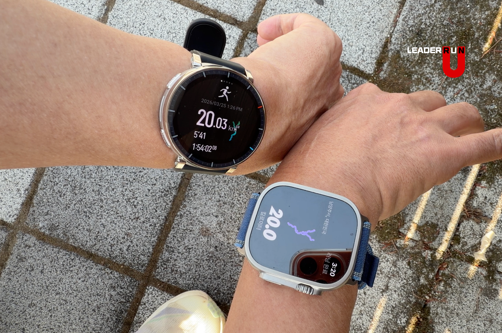 이 제품을 선택할 때 가장 중요한 부분 중 하나가 바로 운동 기능일 텐데요. 실제 야외 러닝에서 애플워치 울트라3와 비교해 봤을 때, 20km 기준으로 거의 차이 없는 거리 측정을 보여줘 꽤 인상적이었습니다. 액티브3 프리미엄이 20.03km를 표시했으니 거리 정확도는 상당히 준수한 편입니다.
