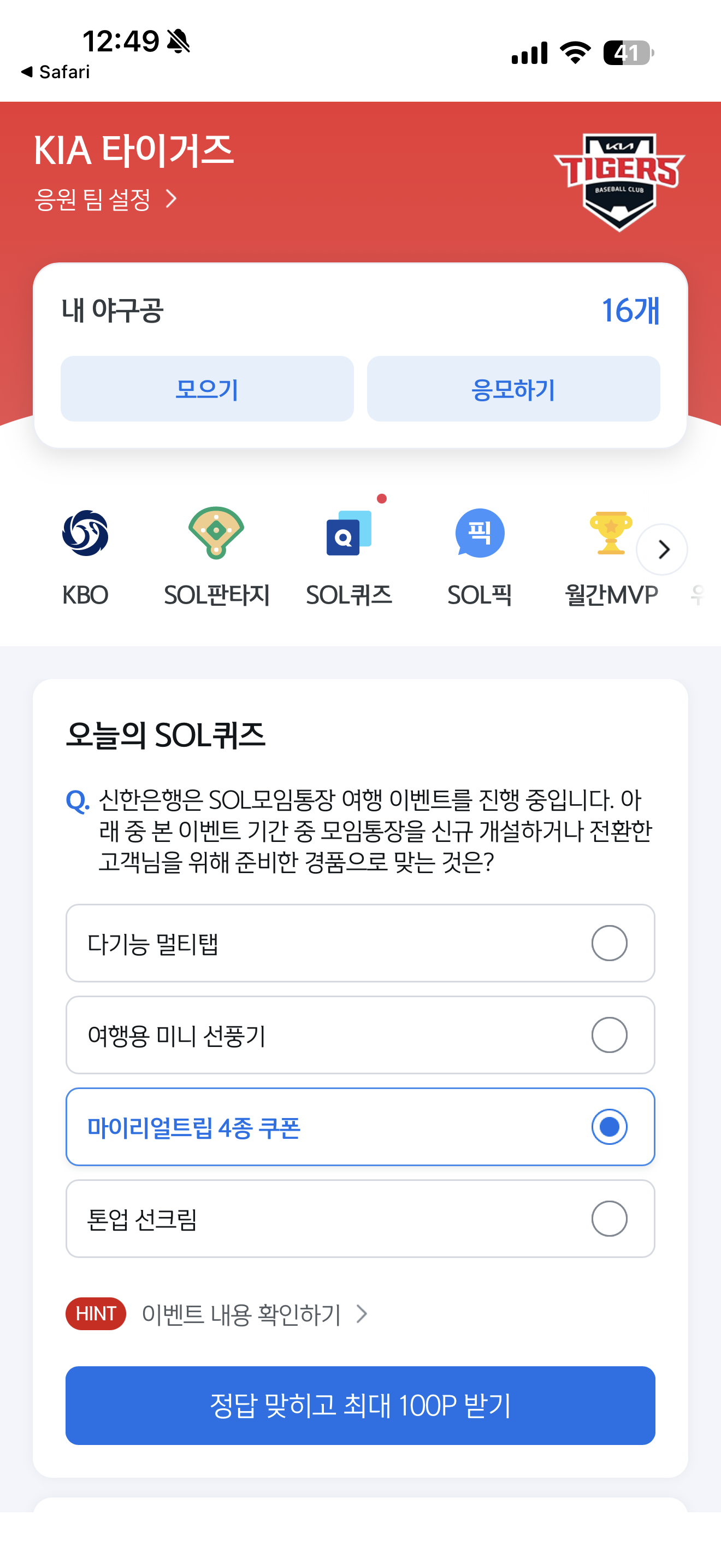 신한은행 SOL야구 쏠퀴즈 정답은 마이리얼트립 4종 쿠폰 입니다