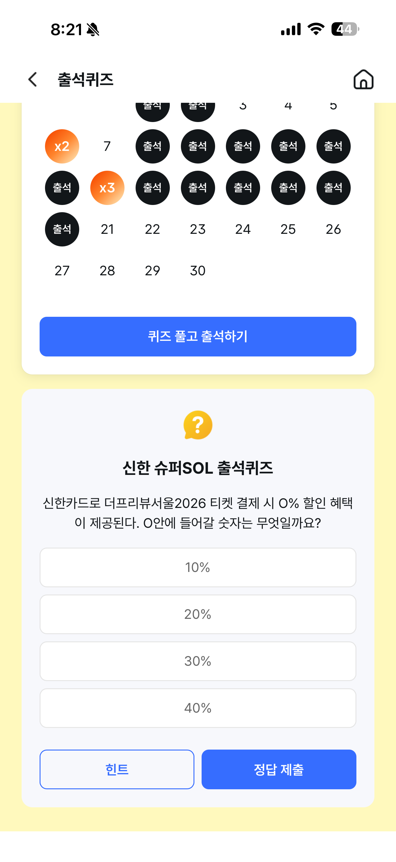 신한 슈퍼SOL 출석퀴즈 4월 21일 정답(신한카드로 더프리뷰서울2026 티켓 결제 시 O% 할인 혜택이 제공된다. O안에 들어갈 숫자는 무엇일까요?)
