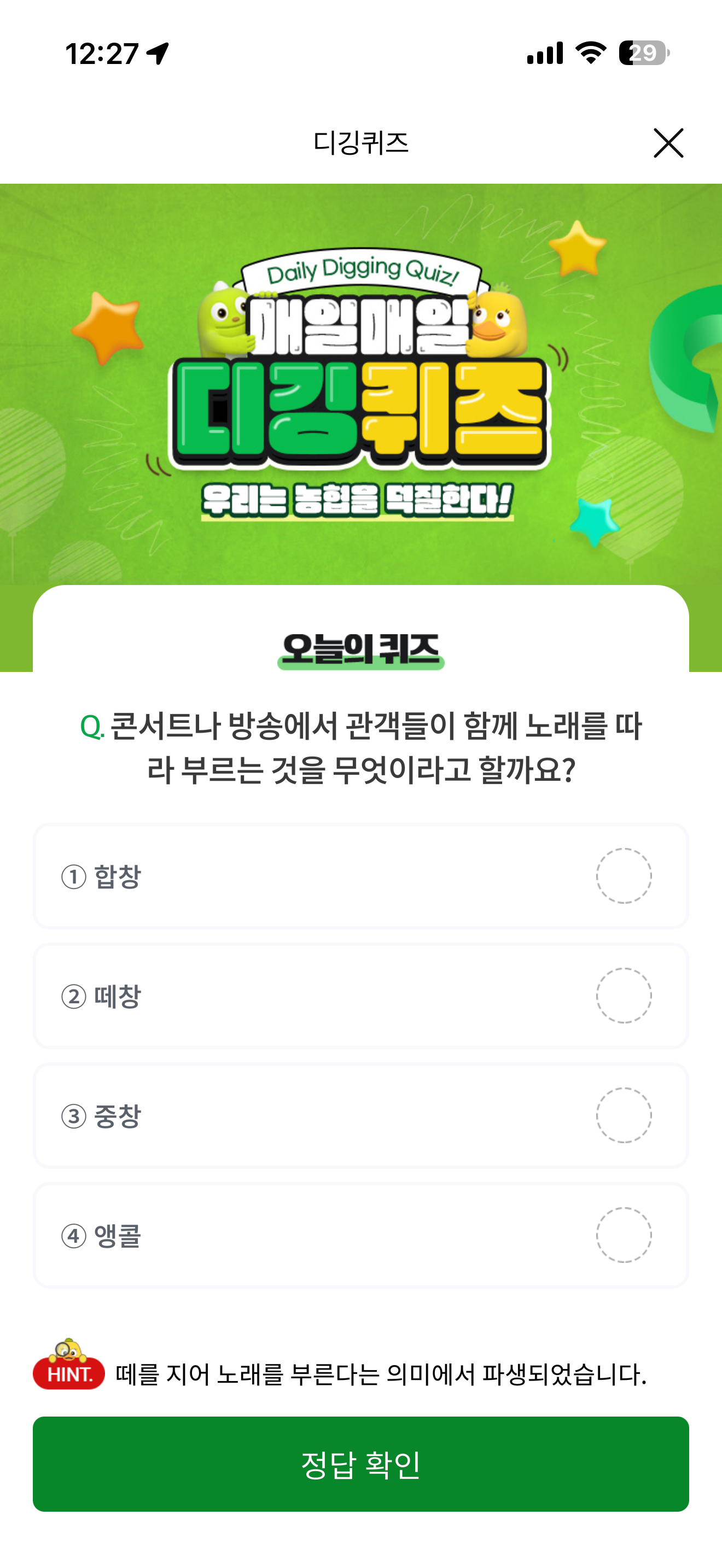 NH올원뱅크 디깅퀴즈 정답은 떼창 입니다