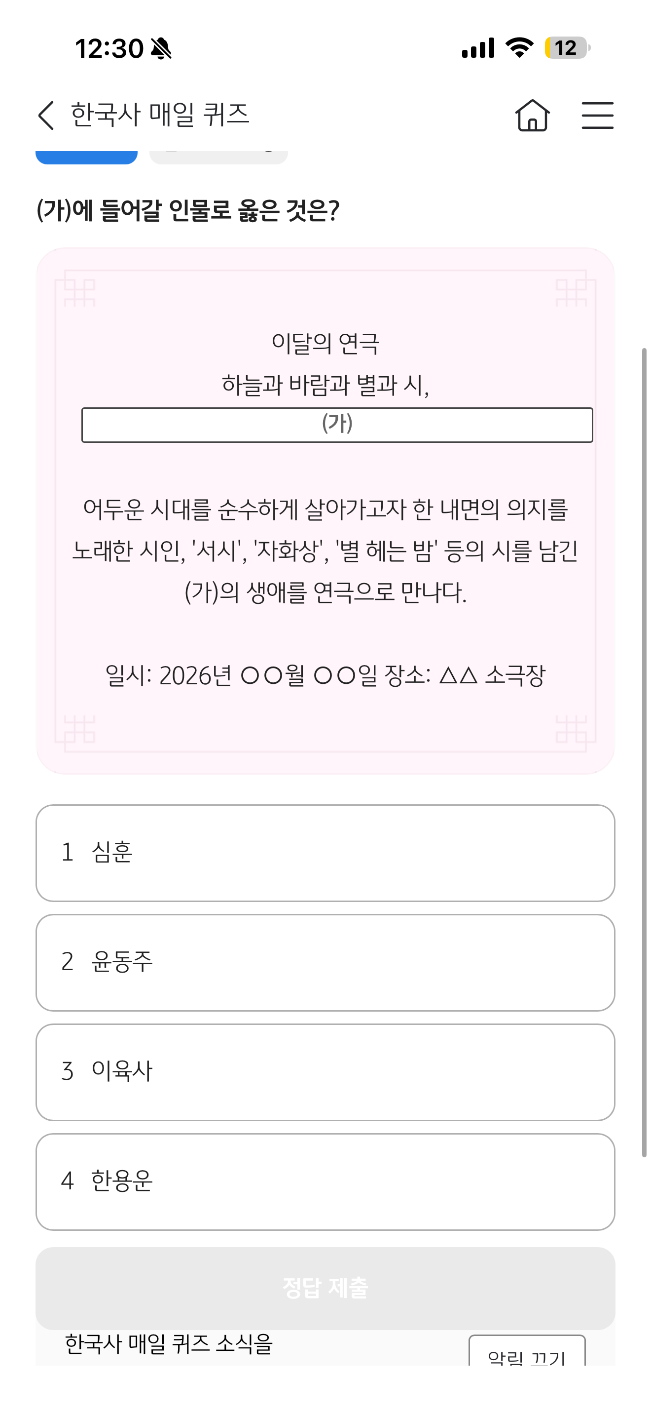 이달의 연극 하늘과 바람과 별과 시, 어두운 시대를 순수하게 살아가고자 한 내면의 의지를 노래한 시인 '서시', '자화상', '별 헤는 밤' 등의 시를 남긴 (가)의 생애를 연극으로 만나다 보기는 1. 심훈 2. 윤동주 3. 이육사 4. 한용운 입니다
