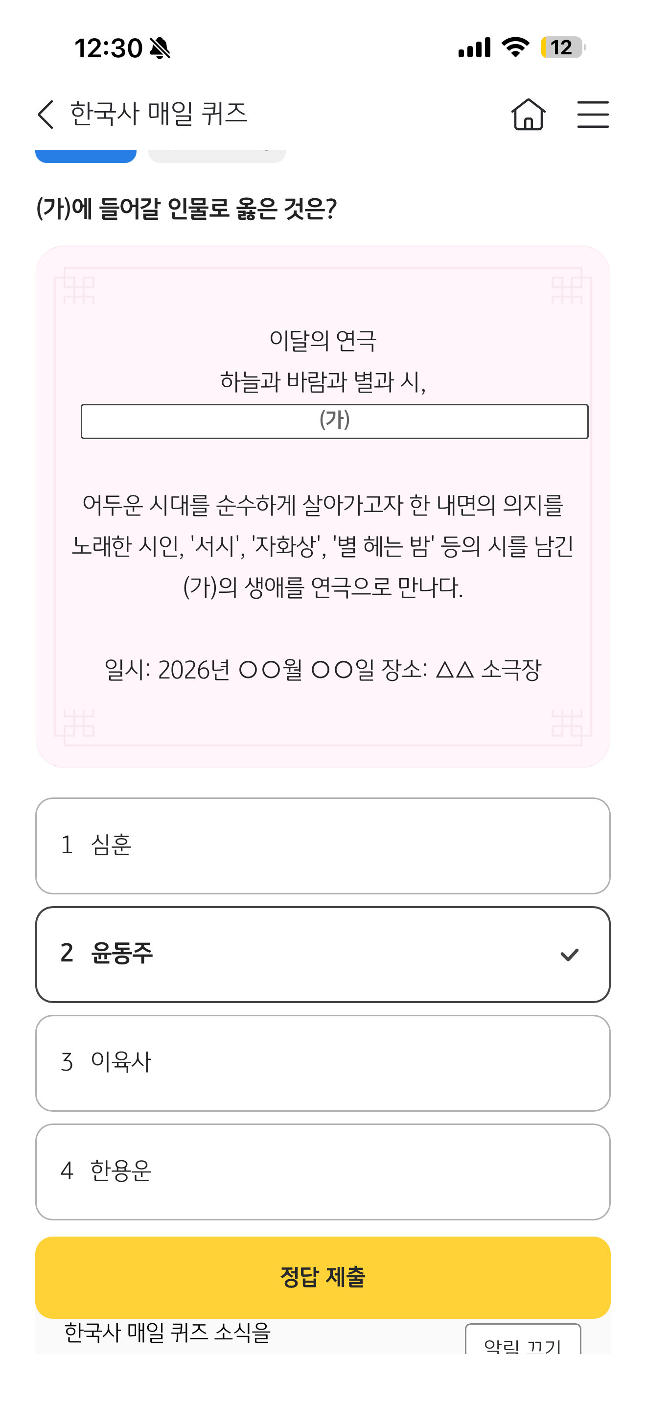 KB스타뱅킹 한국사 매일 퀴즈 정답은 윤동주 입니다