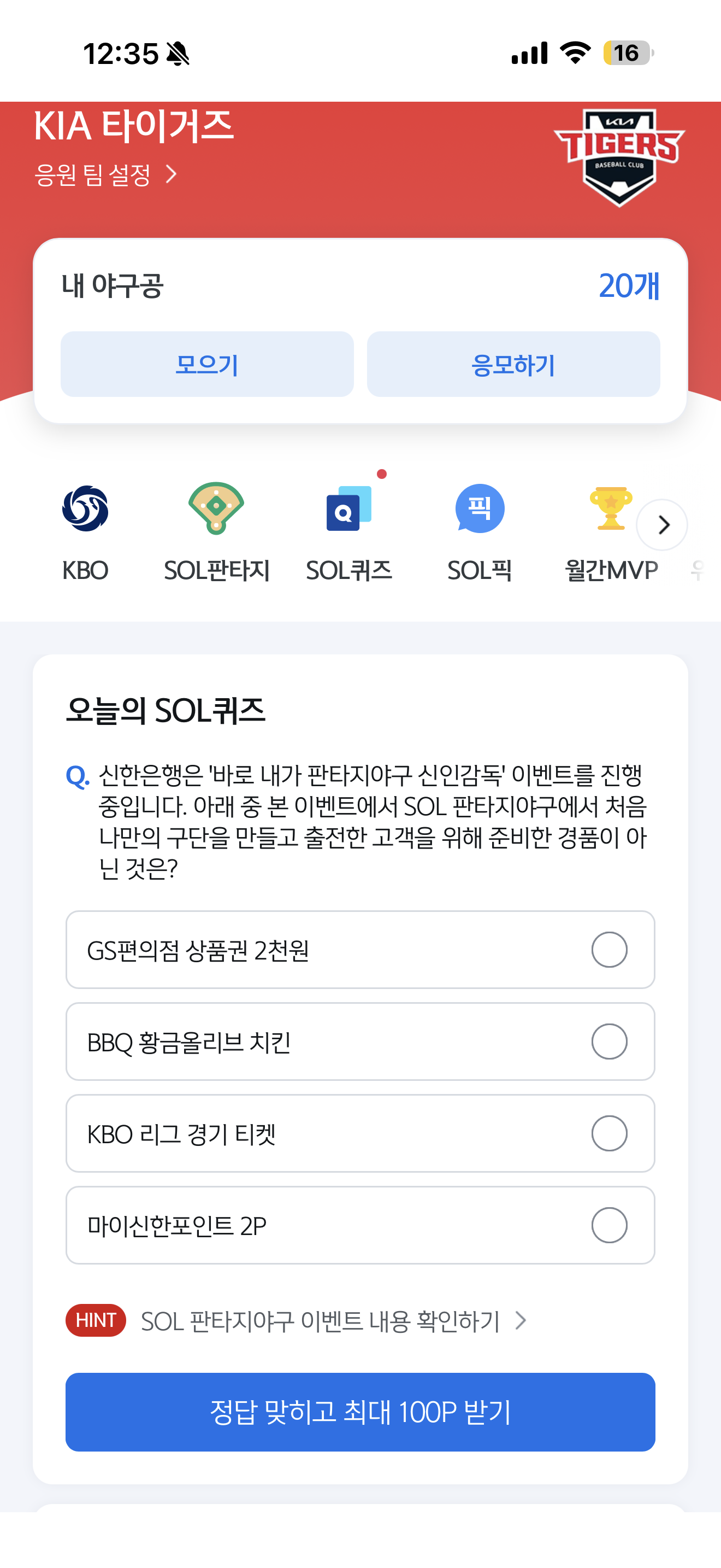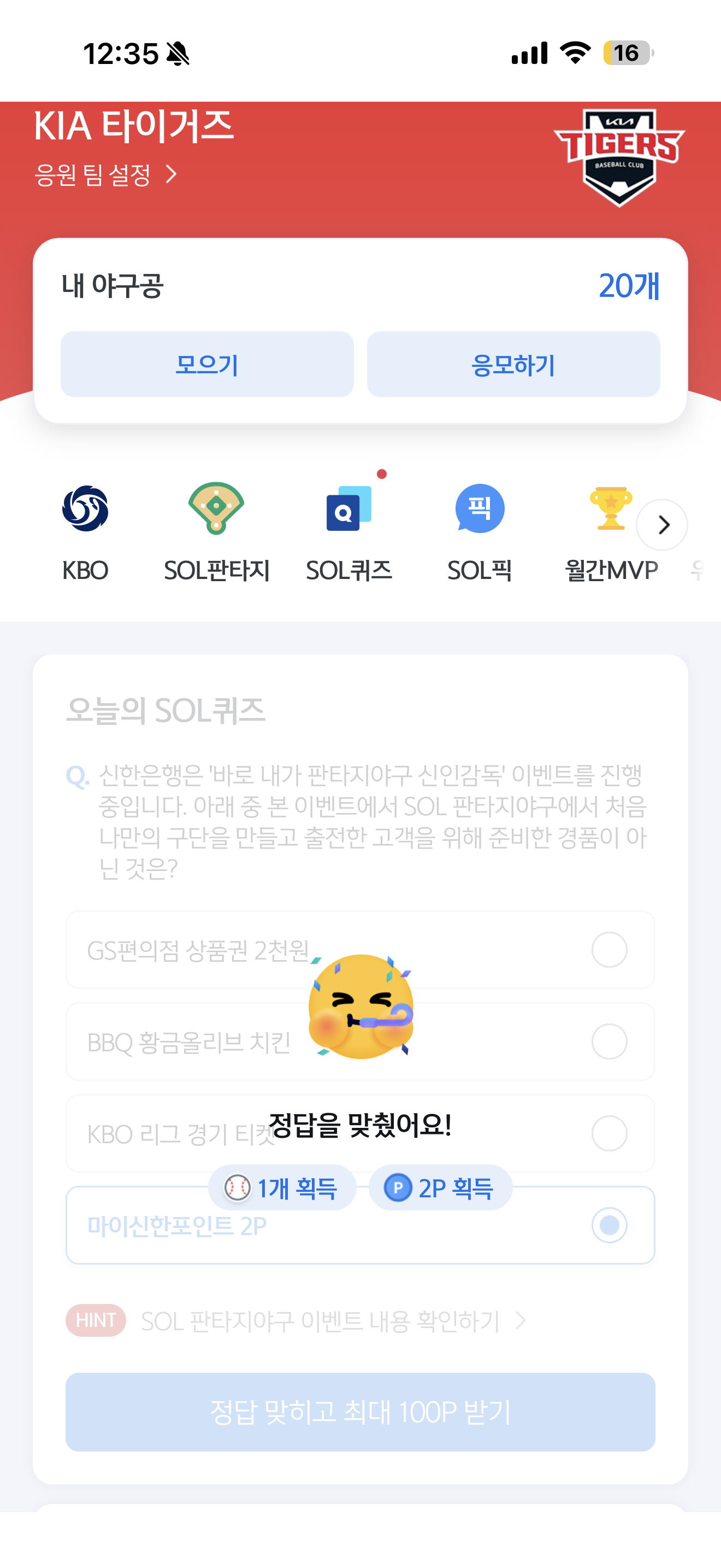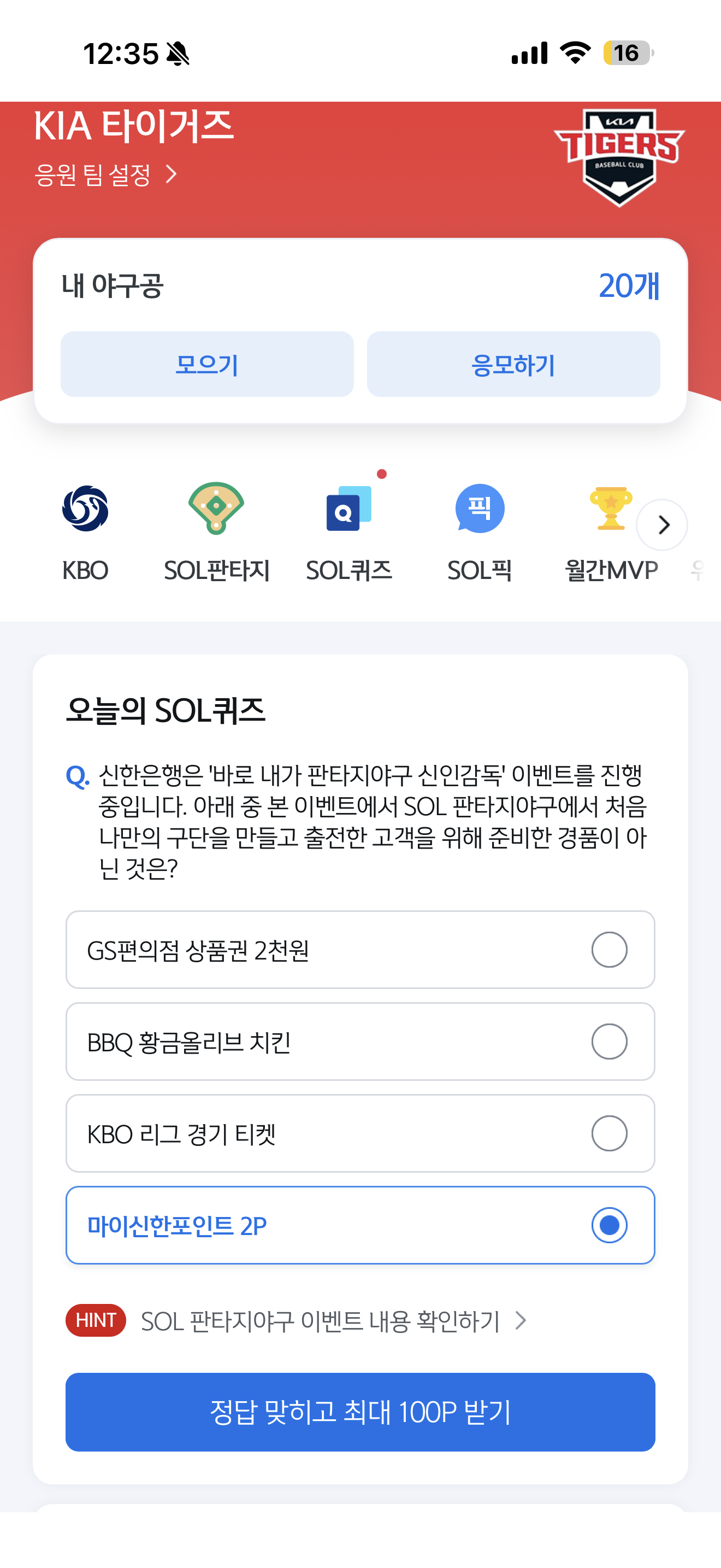 신한은행 SOL야구 쏠퀴즈 정답은 마이신한포인트 2P 입니다