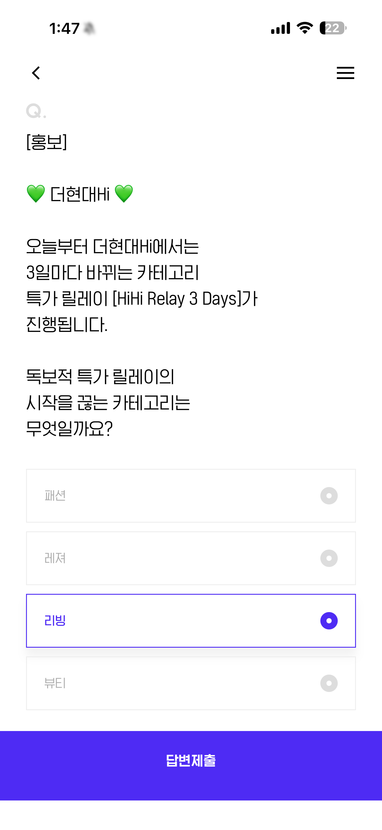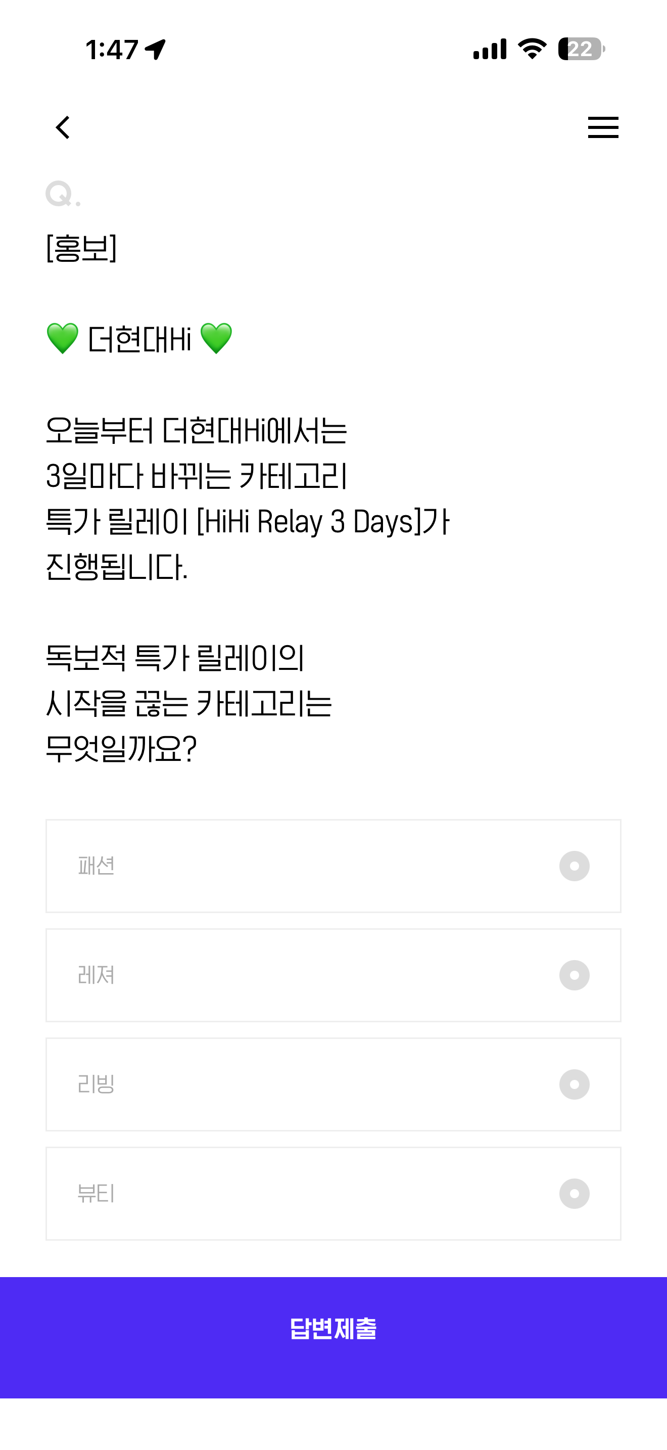 오늘부터 더현대Hi에서는 3일마다 바뀌는 카테고리 특가 릴레이 [HiHi Relay 3 Days)가 진행됩니다. 독보적 특가 릴레이의 시작을 끊는 카테고리는 무엇일까요? 보기는 1. 패션 2. 레져 3. 리빙 4. 뷰티 입니다.