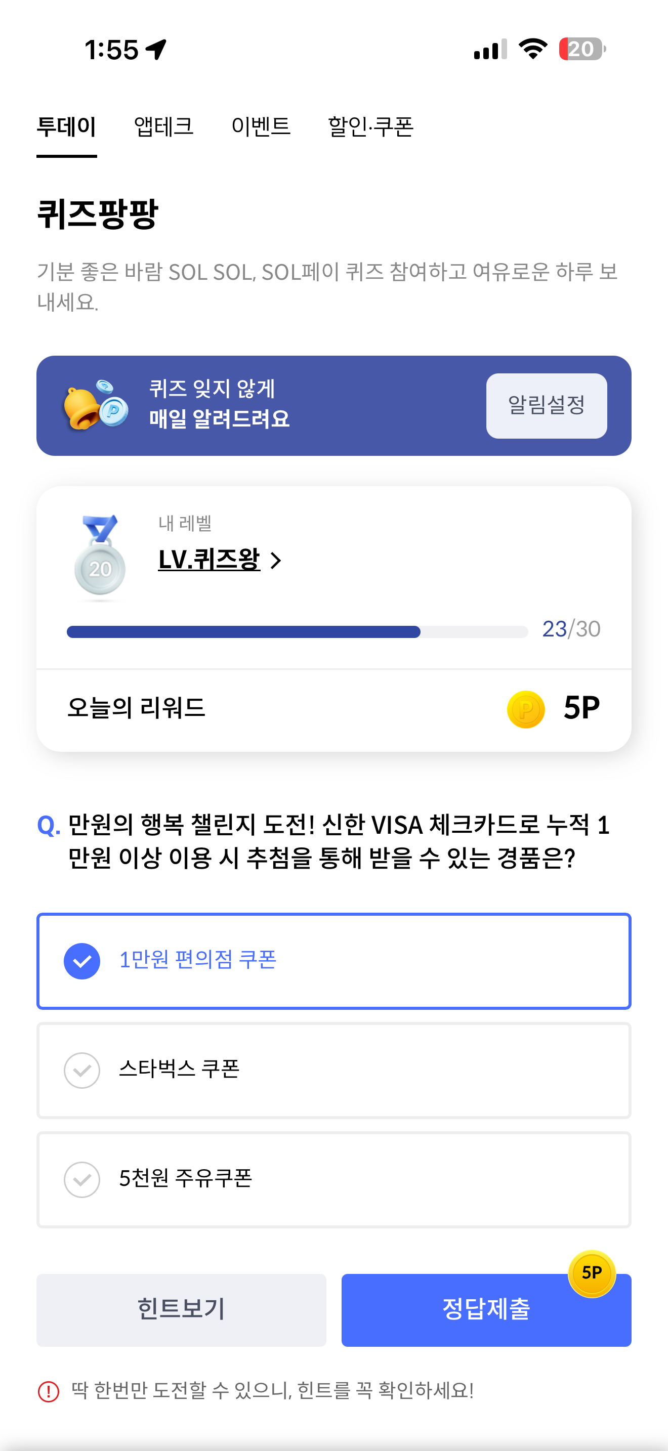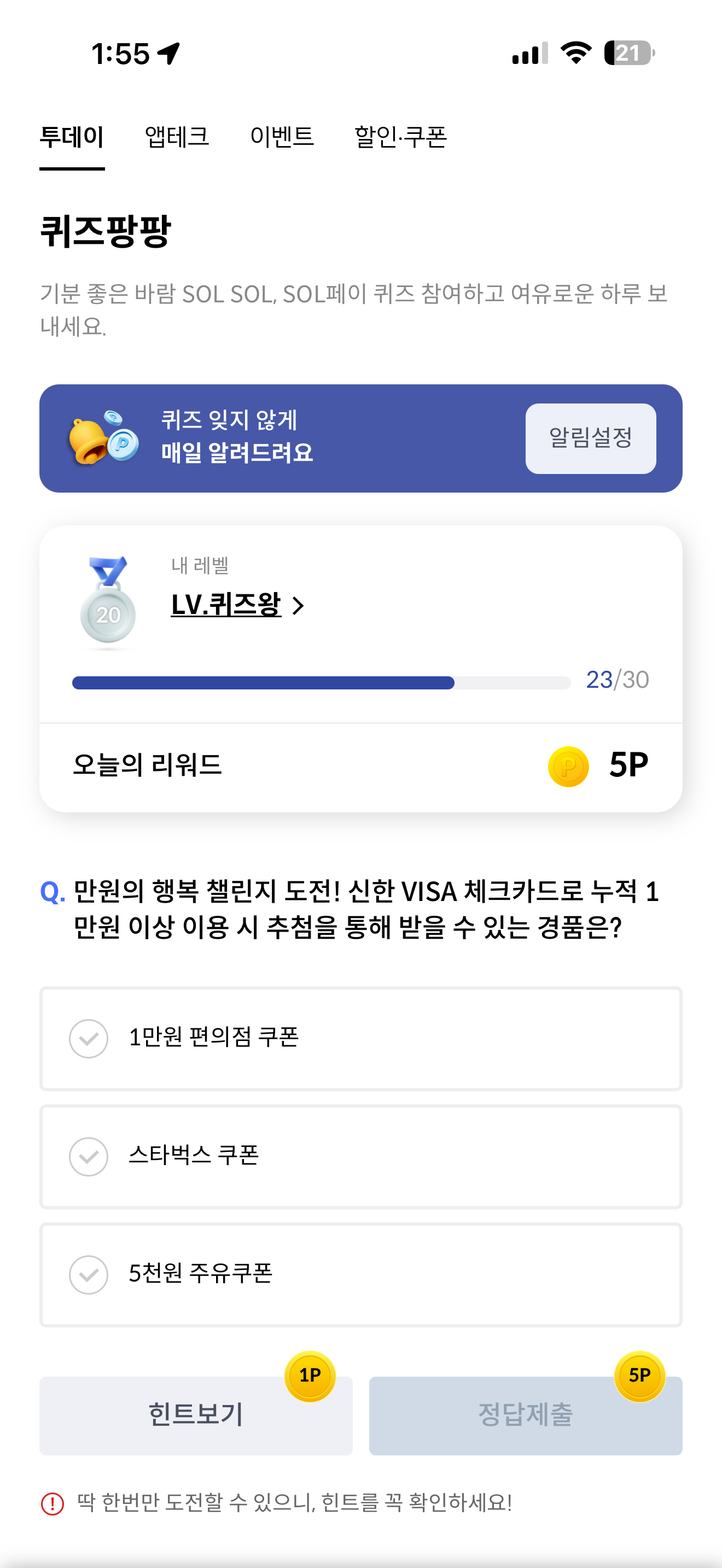만원의 행복 챌린지 도전! 신한 VISA 체크카드로 누적 1만원 이상 이용 시 추첨을 통해 받을 수 있는 경품은? 보기는 1. 1만원 편의점 쿠폰 2. 스타벅스 쿠폰 3. 5천원 주유쿠폰 입니다