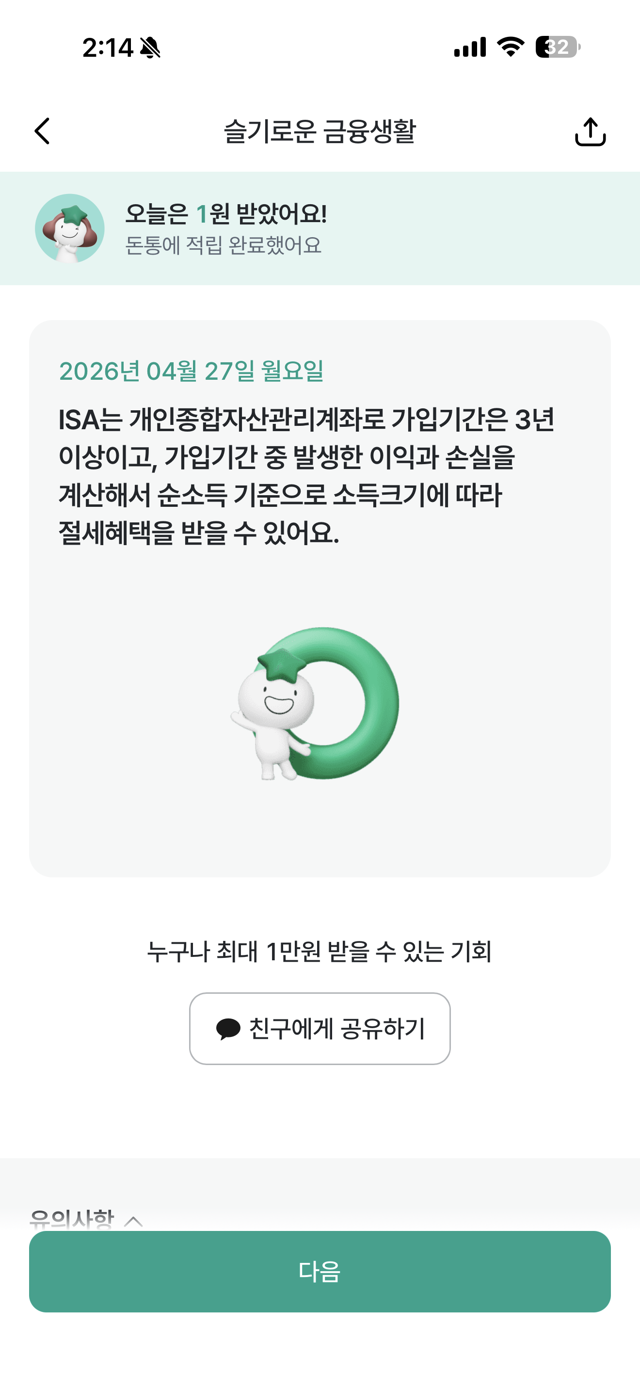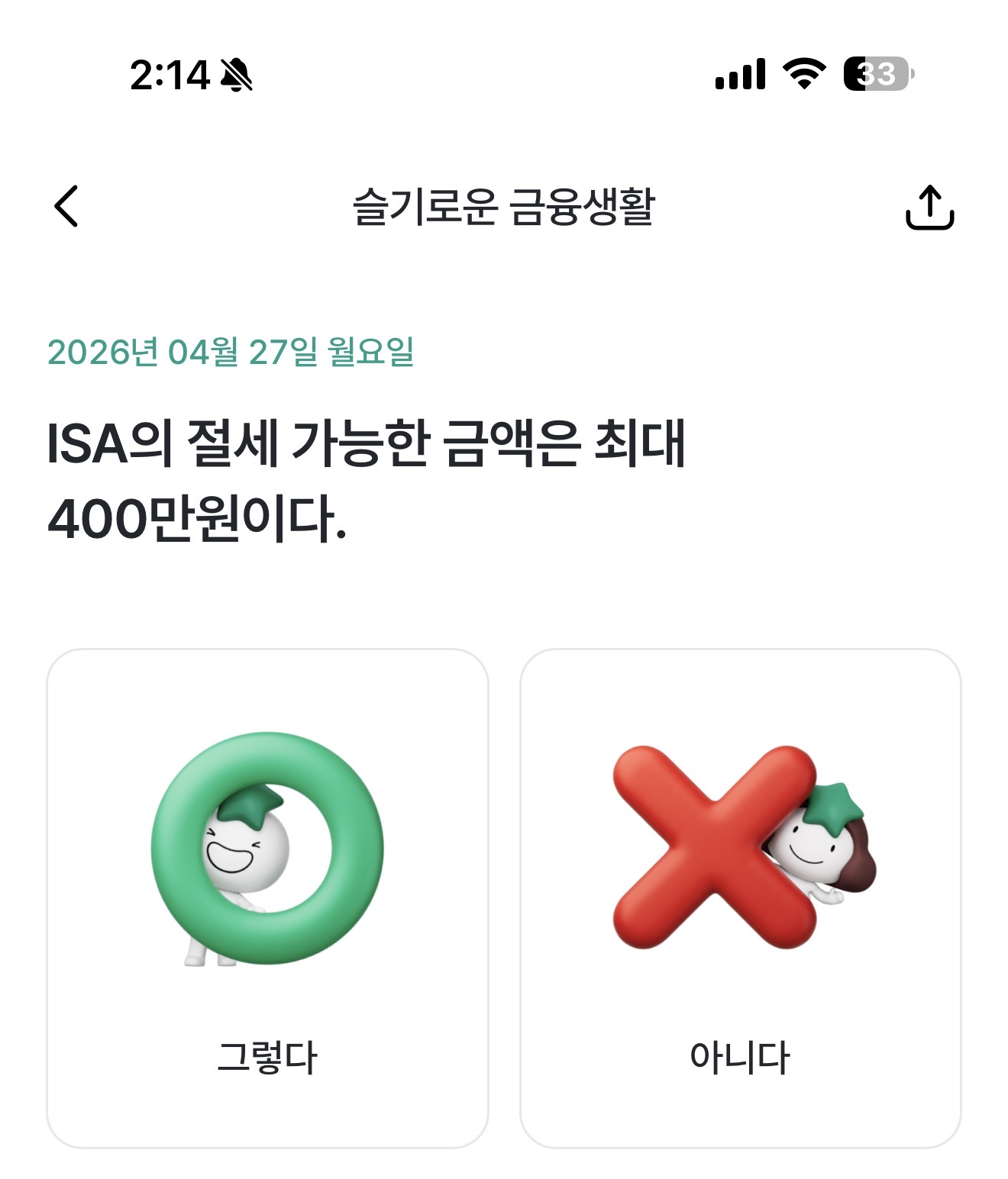 하나원큐 슬기로운 금융생활 OX퀴즈 4월 27일 정답(ISA의 절세 가능한 금액은 최대 400만원이다)