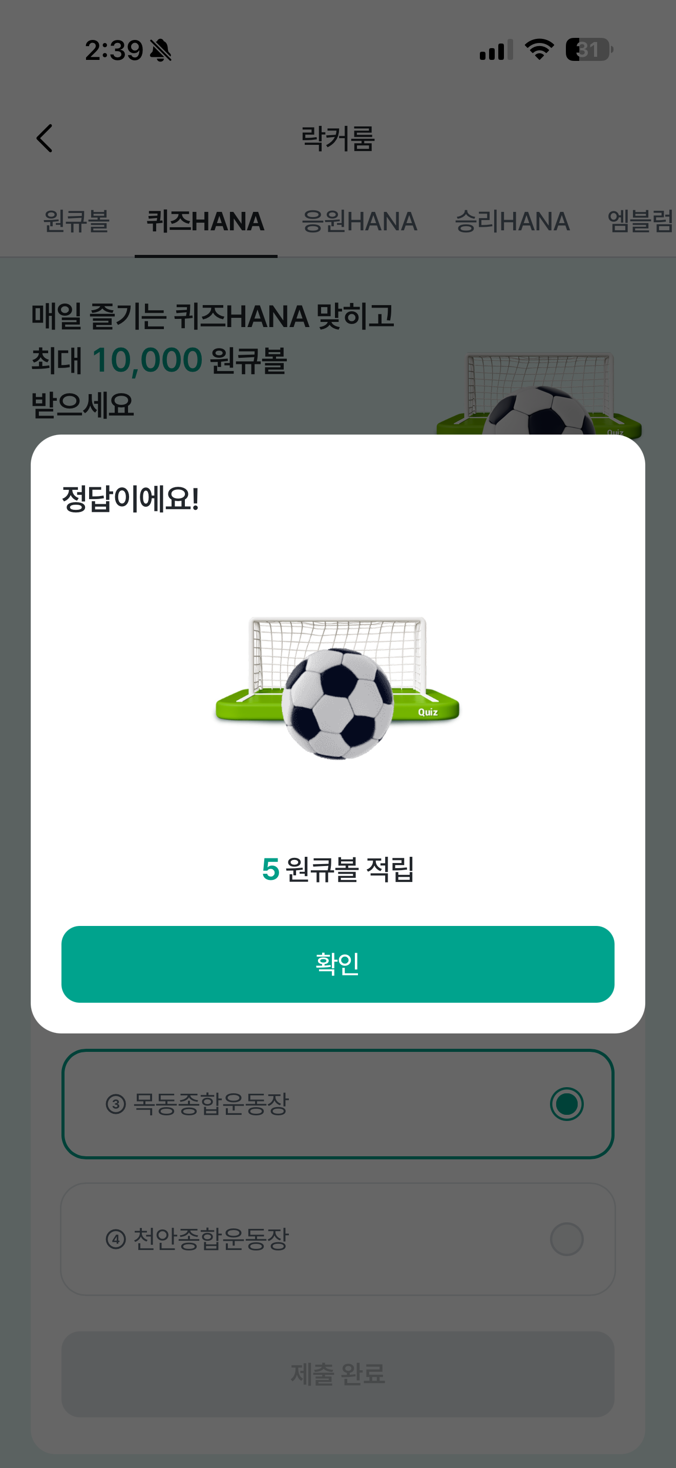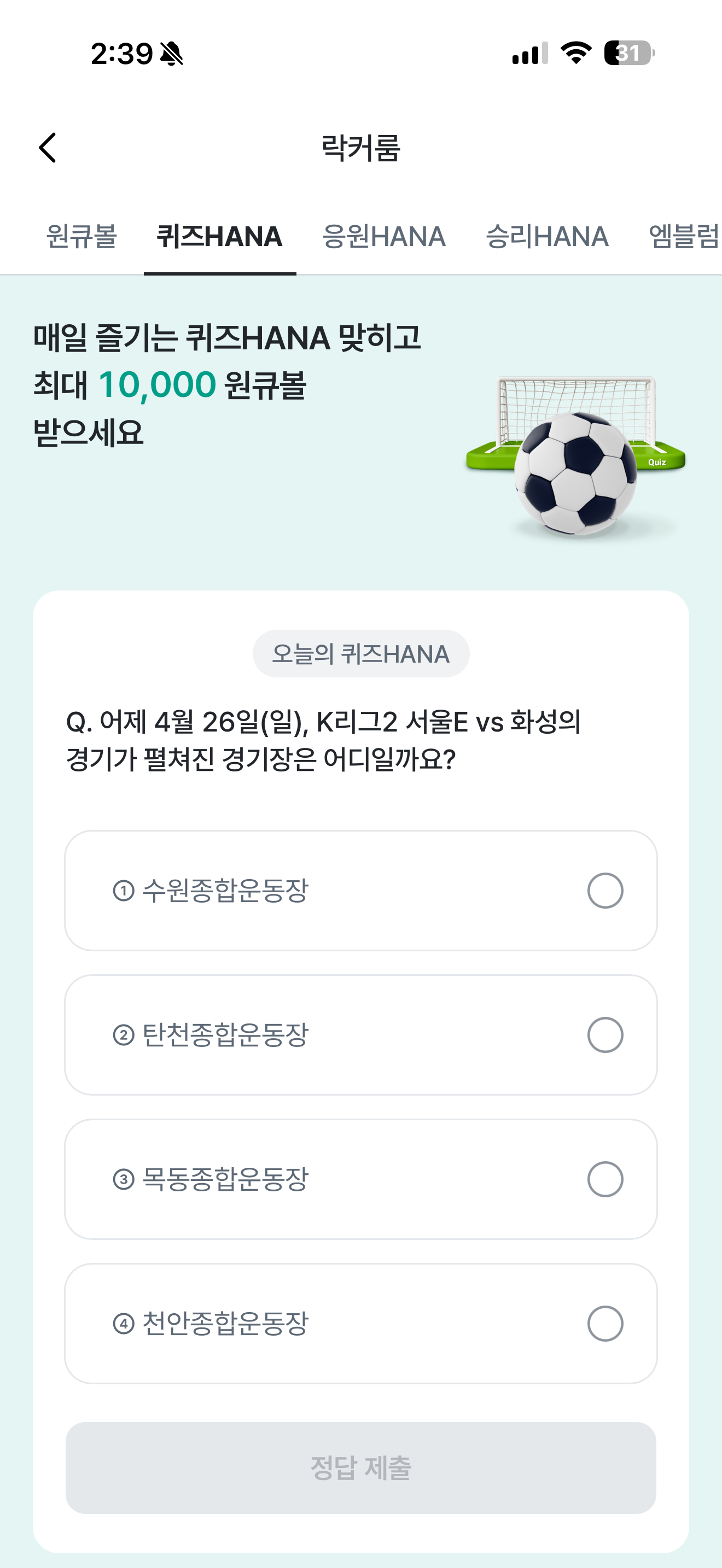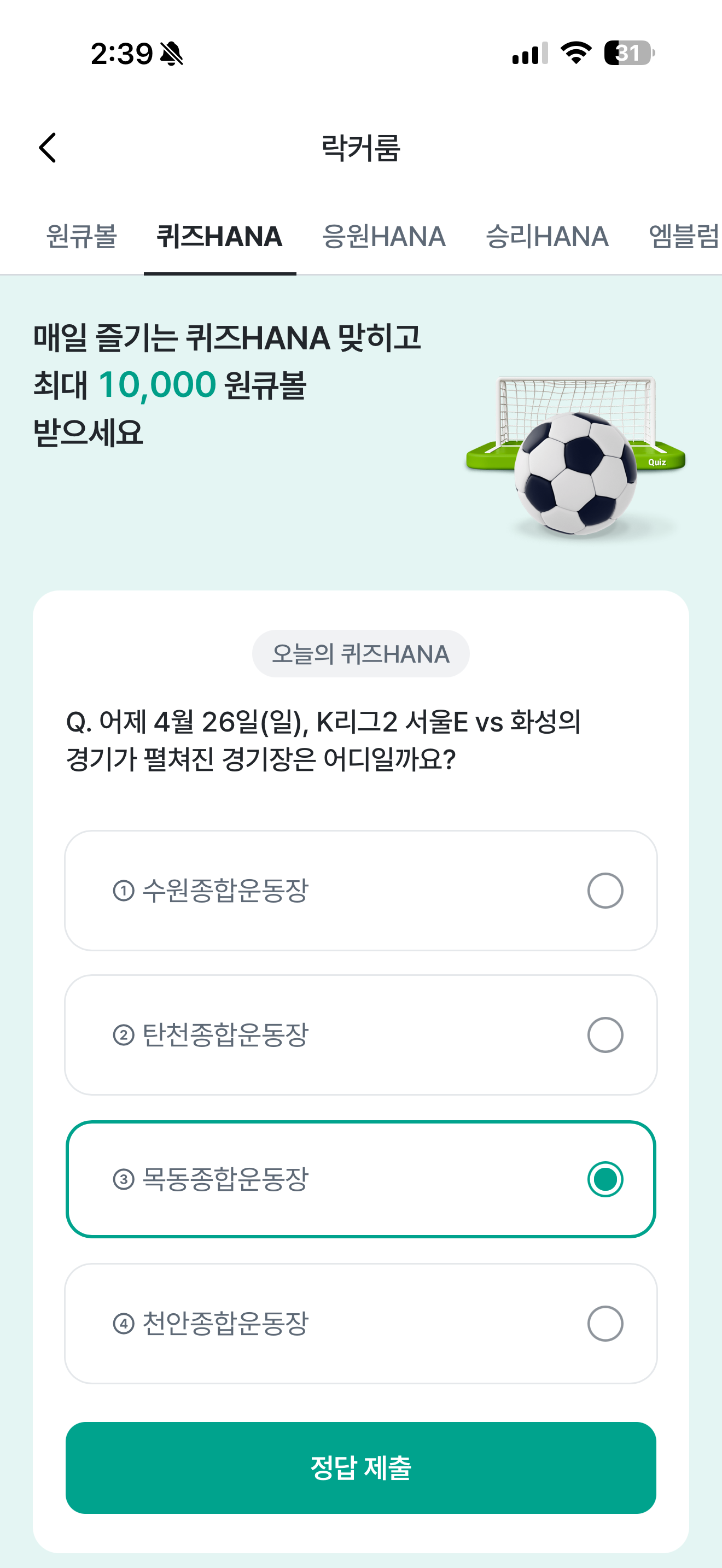 하나원큐 축구 play 퀴즈 HANA 정답은 목동종합운동장 입니다