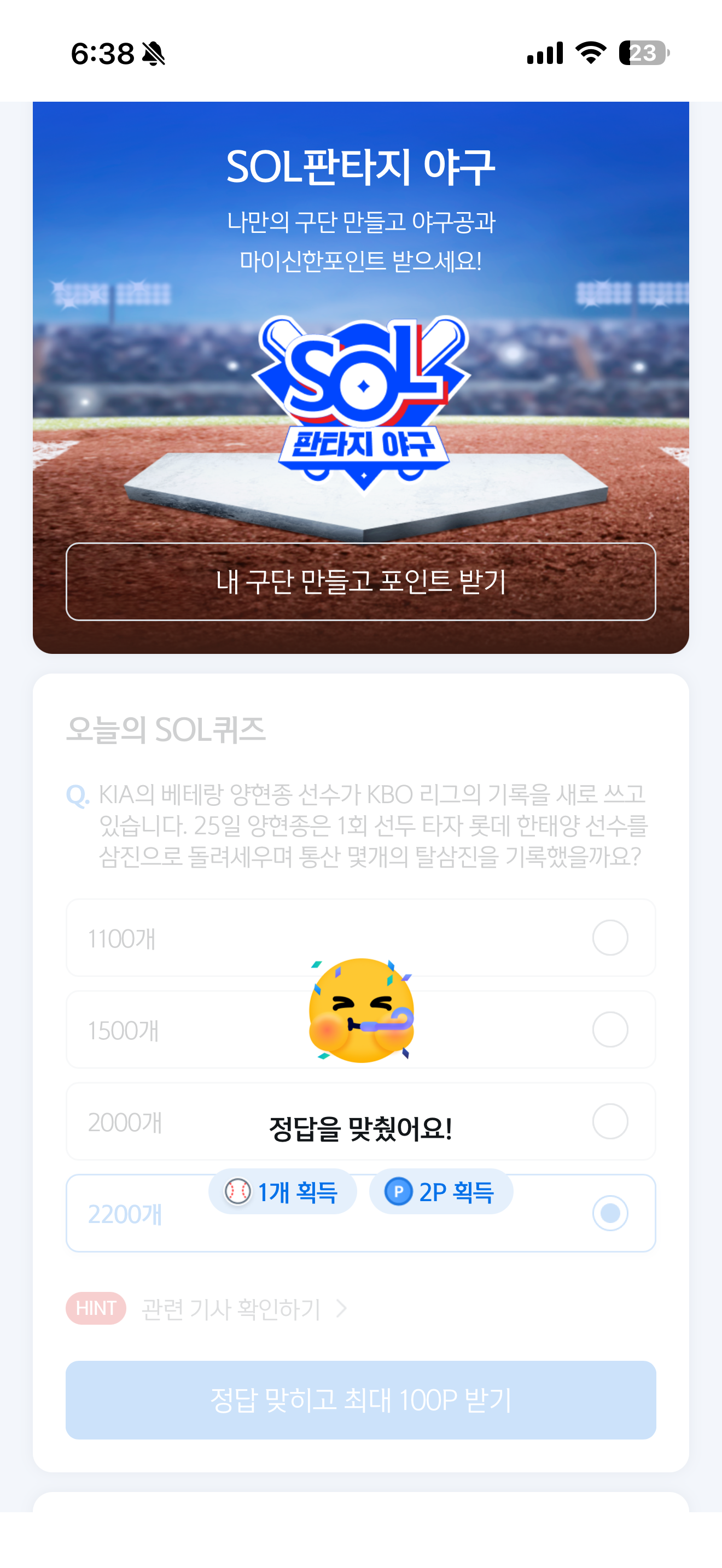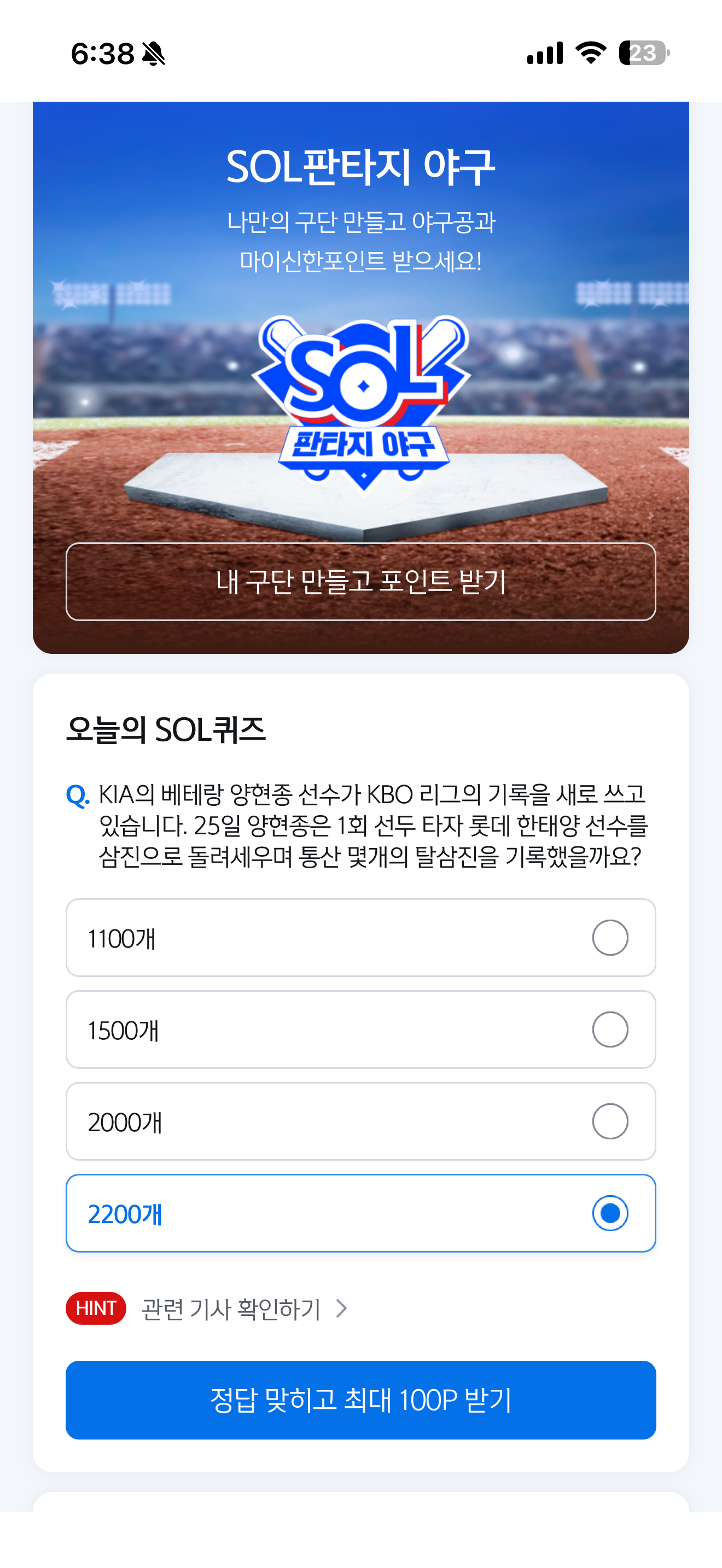신한은행 SOL야구 쏠퀴즈 정답은 2200개 입니다