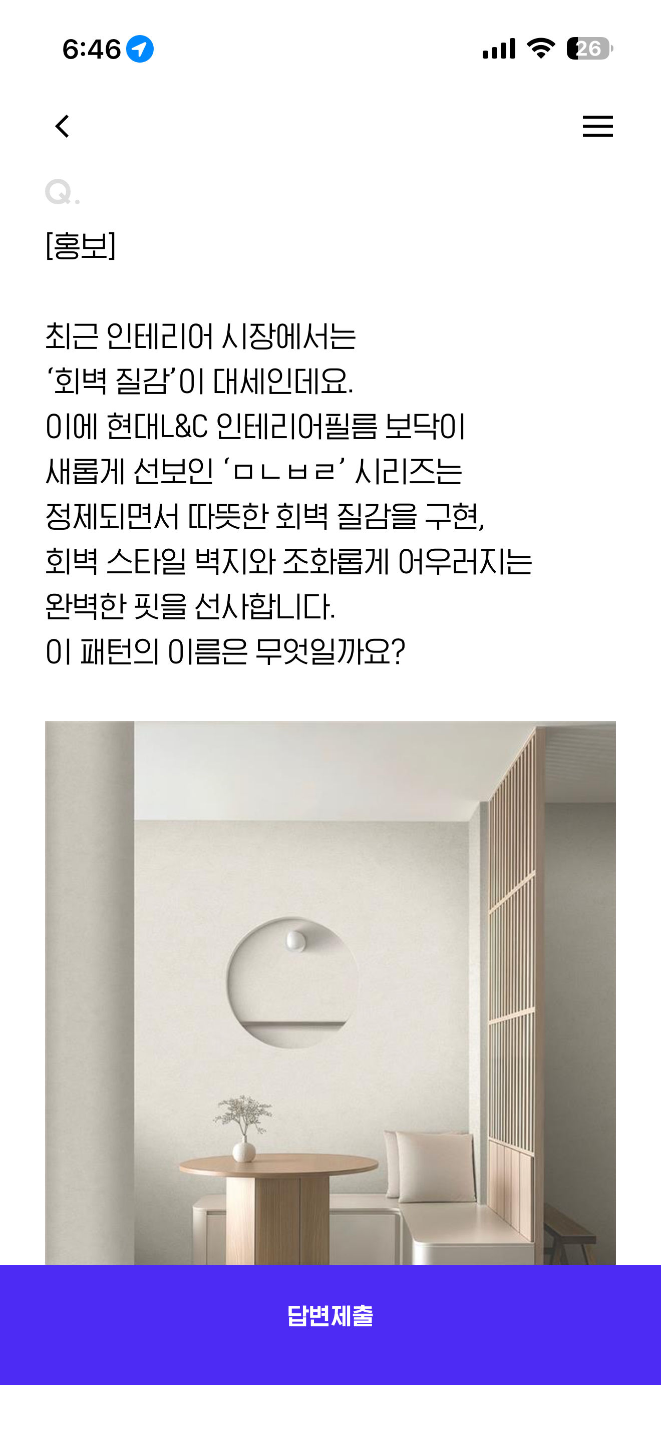 최근 인테리어 시장에서는 '회벽 질감'이 대세인데요. 이에 현대L&C 인테리어필름 보닥이 새롭게 선보인 ' ㅁㄴㅂㄹ' 시리즈는 정제되면서 따뜻한 회벽 질감을 구현, 회벽 스타일 벽지와 조화롭게 어우러지는 완벽한 핏을 선사합니다. 이 패턴의 이름은 무엇일까요?