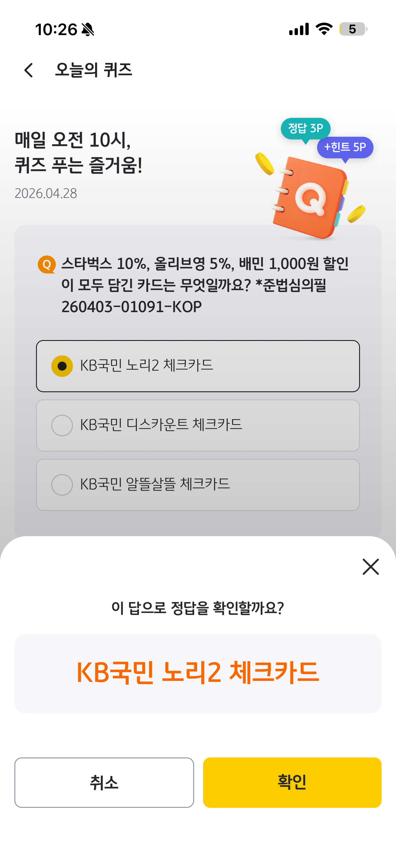 KB Pay 오늘의 퀴즈 정답은 KB국민 노리2 체크카드 입니다